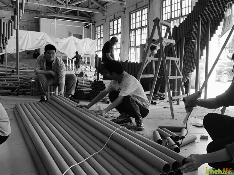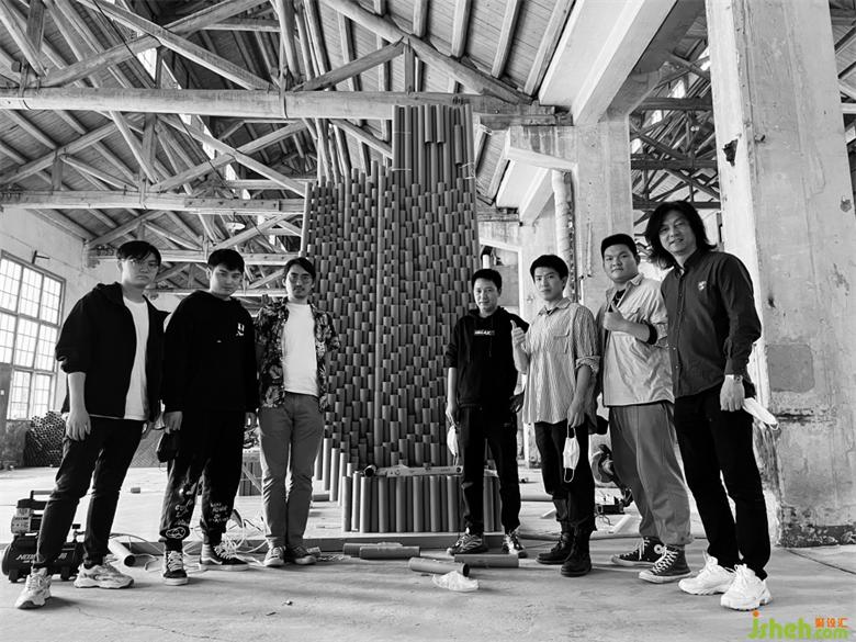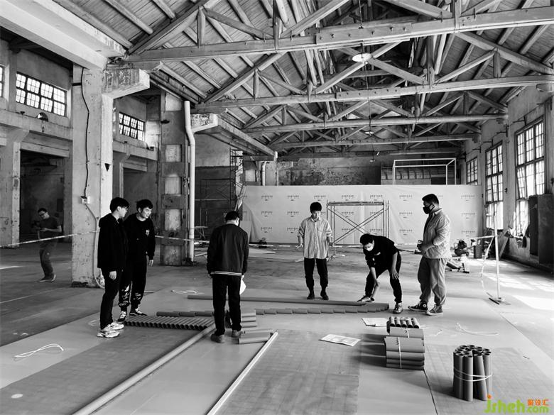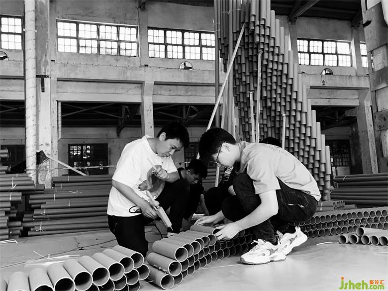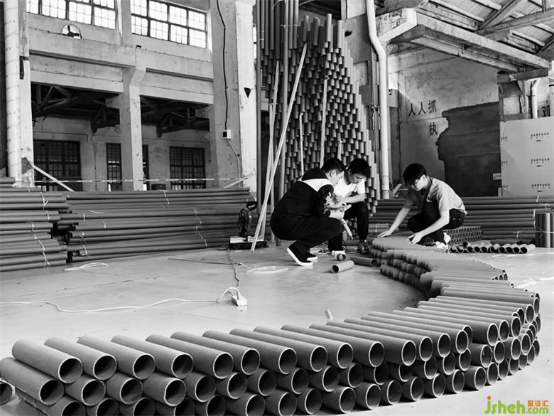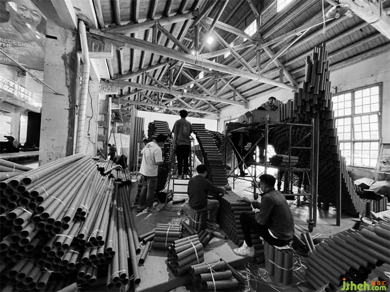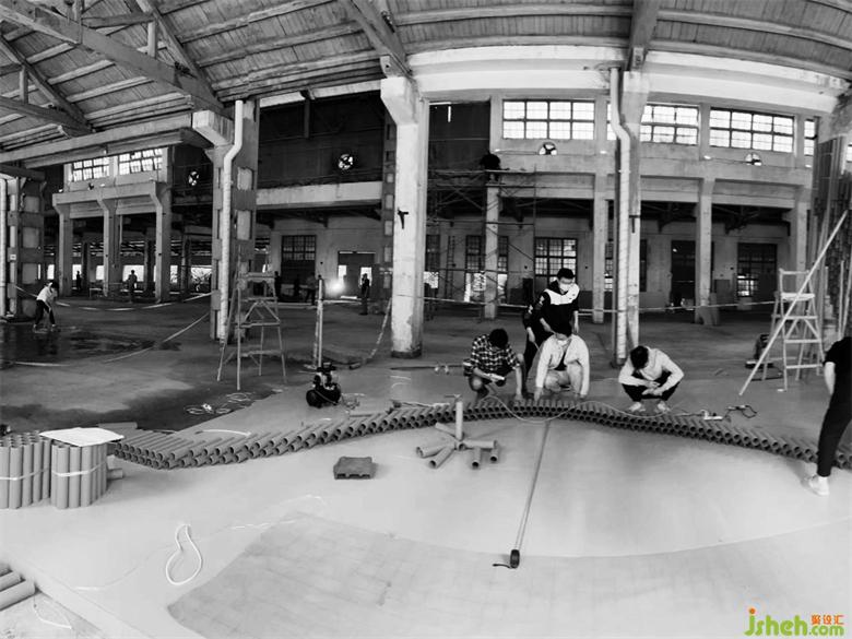 在搭建的第三天晚上,还遭遇了重庆史上难遇的9级大风,因为现场是废旧的厂房,早已无完整的长门和窗外做遮挡,作品的力学支撑也还未完全成型,前几天搭建好的损坏了近三分之一。