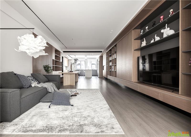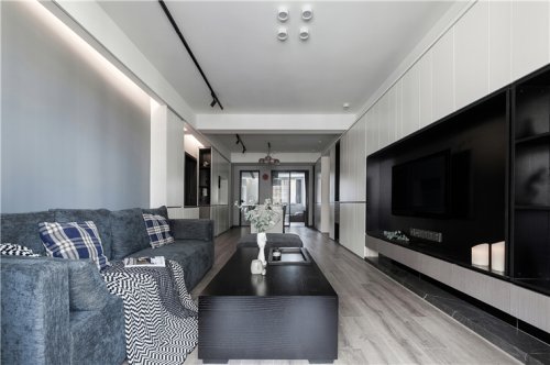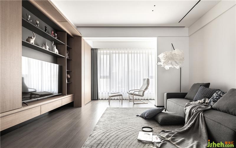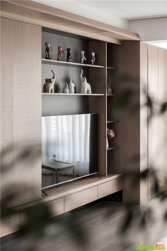 悬空的电视背景墙很好地平衡了进门视线的穿透性与私密性,同时下方的整排抽屉柜让镂空的台面得以保持整洁厦门室内设计。