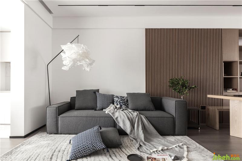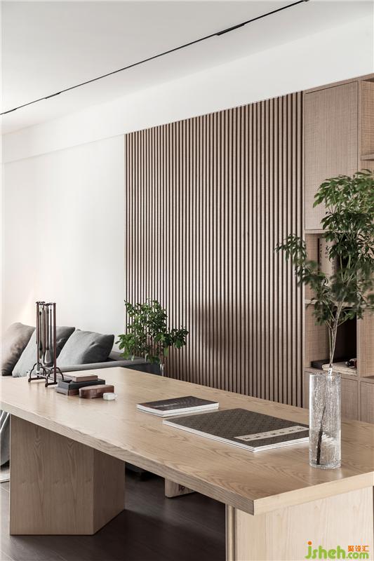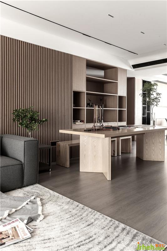 以木栅格板为背景的开放式客厅之中,四面皆可坐的沙发成为客厅的中心,形成一个环绕式动线,黑白灰之中舒适的卡其色是家中的主色调,简单而不平庸。