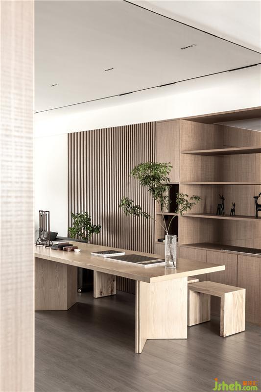 超长桌面的设计满足了男主人想要开阔的写书法需求,同时兼并接待朋友功能,与女主人互相不打扰。