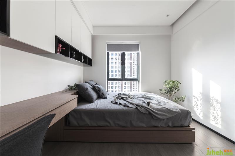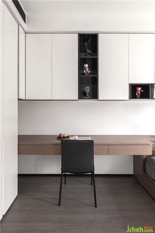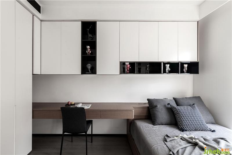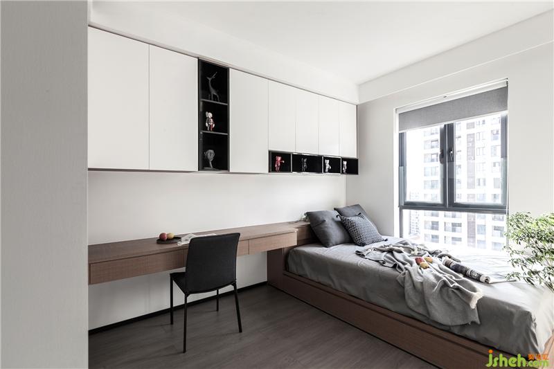 次卧室纯白空间是小孩的房间,床贴柜的形式让桌后空间更加宽裕,衣服存放、书本收纳,看书写作业,休闲玩耍…… 统统满足。