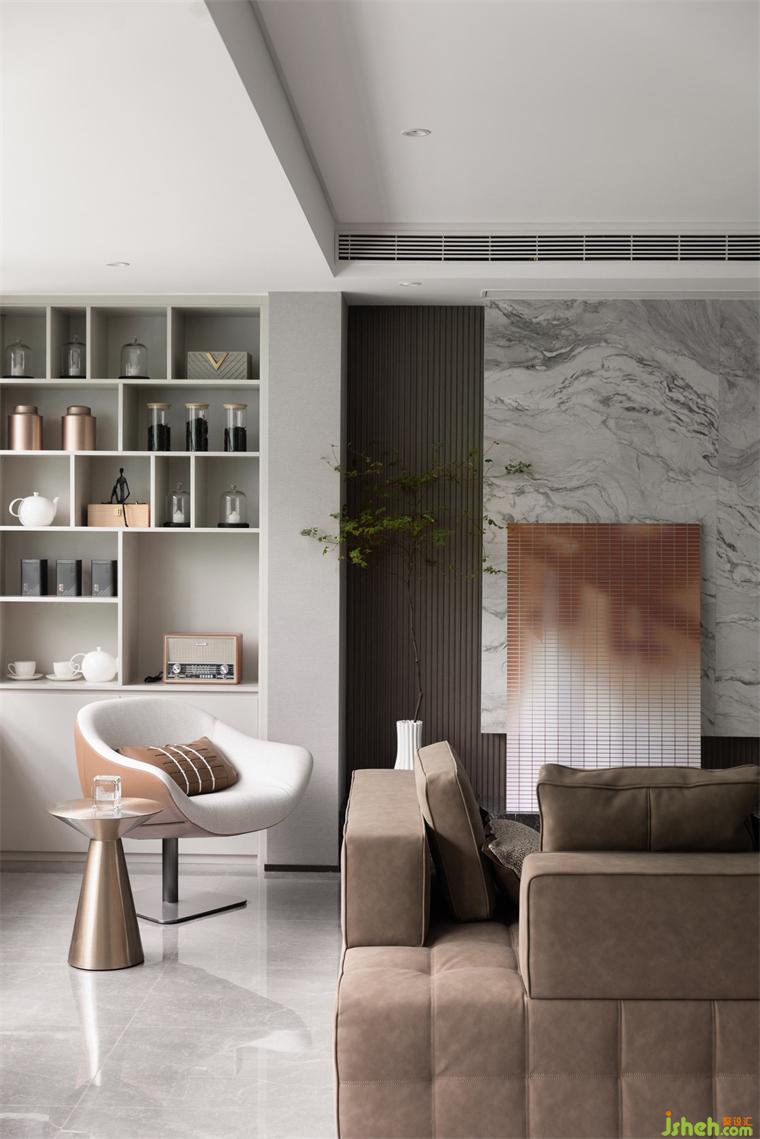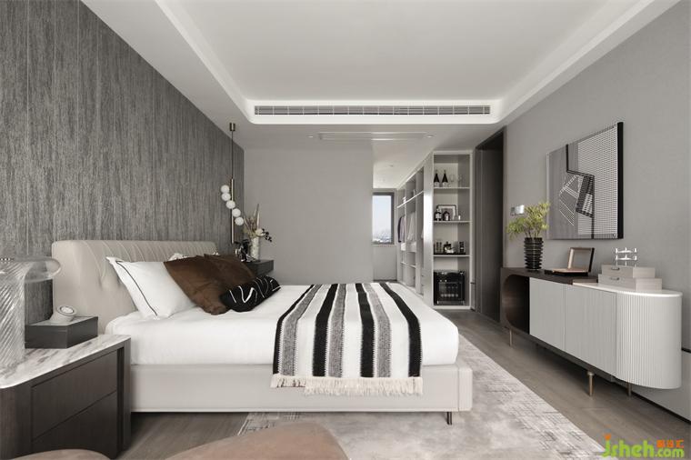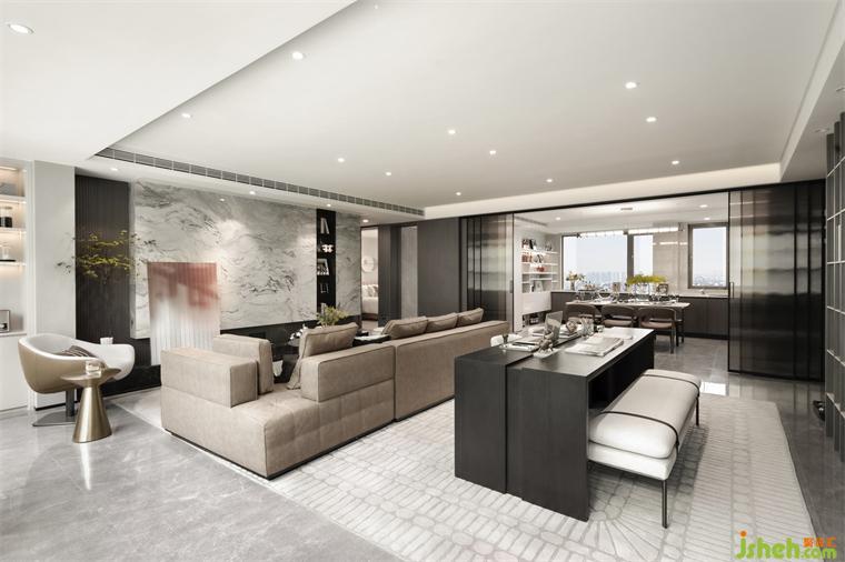 以通透为由,来处理相邻空间的联动情景。样板房设计通过和空间的互相串联,弱化空间的边界感,增强了区域间的视野联系,具备更多灵活变动性的开阔空间。