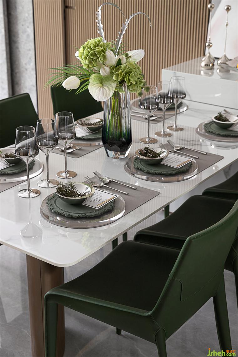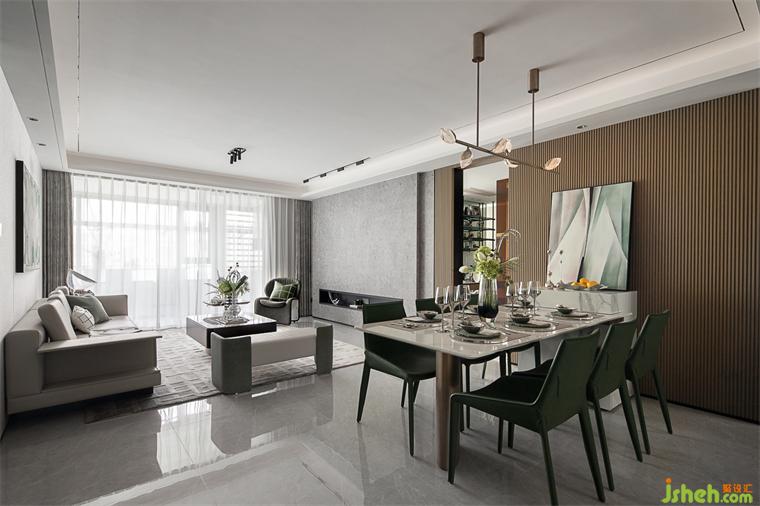 相邻空间的转换松弛而有节奏,客餐厅一体化设计,样板房设计让公共区域成为“社交型”空间,随着时间场景的转换,场域缓缓释放出"物我相融"的和谐感。