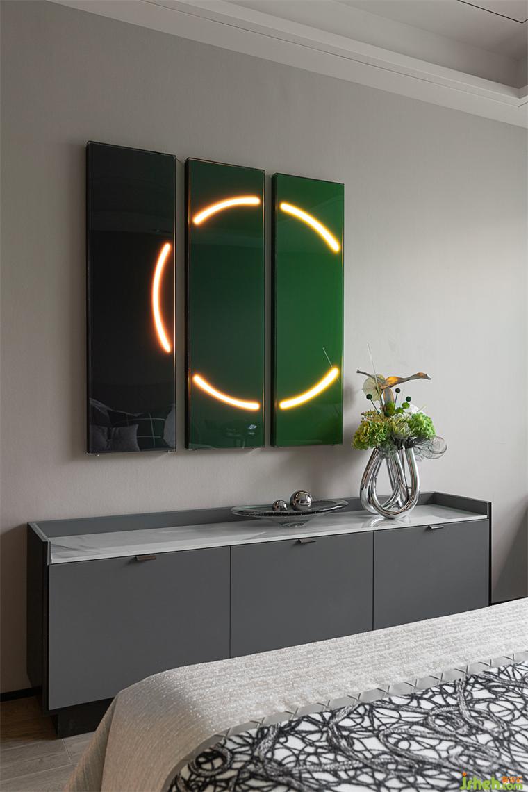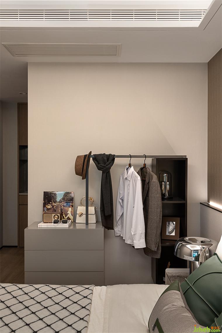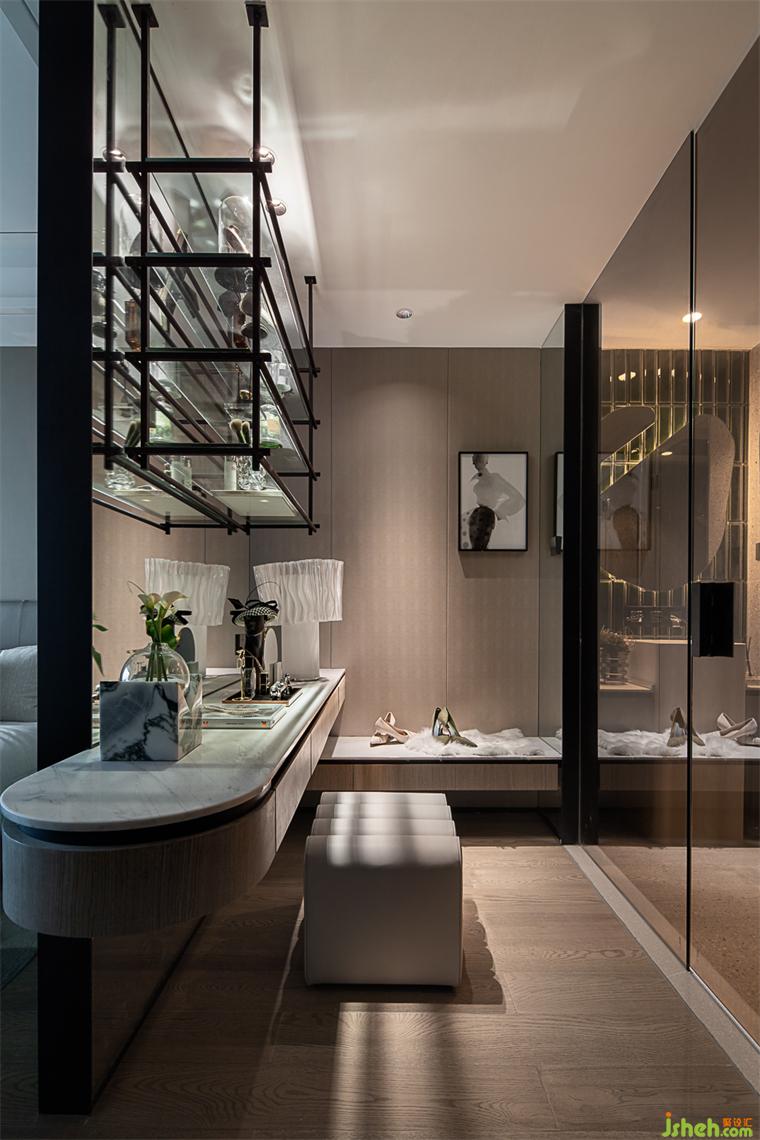 人在空间中的情感交流与活动状态,是丰富空间画面的重要介质,样板房设计独立式的衣帽间,解决了大部分衣物和物品收纳问题,形成区域间的独立性与私密性,同时预留了化妆台位置供平时使用。