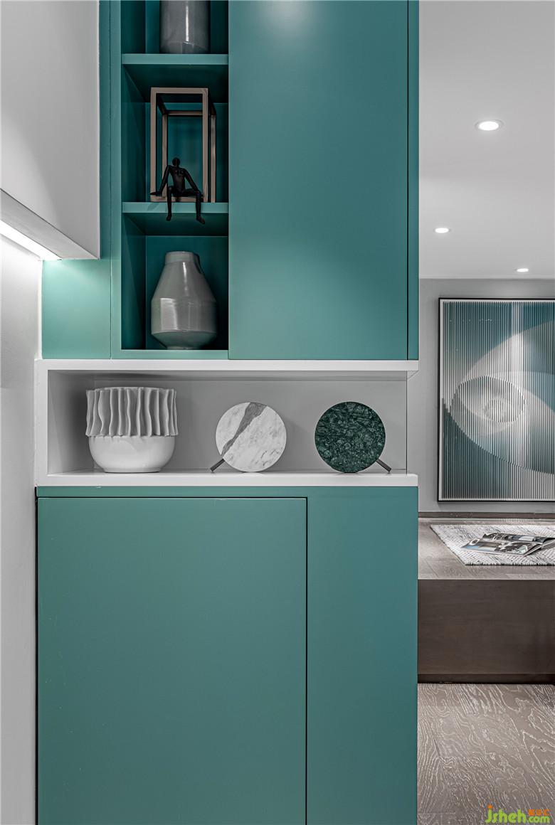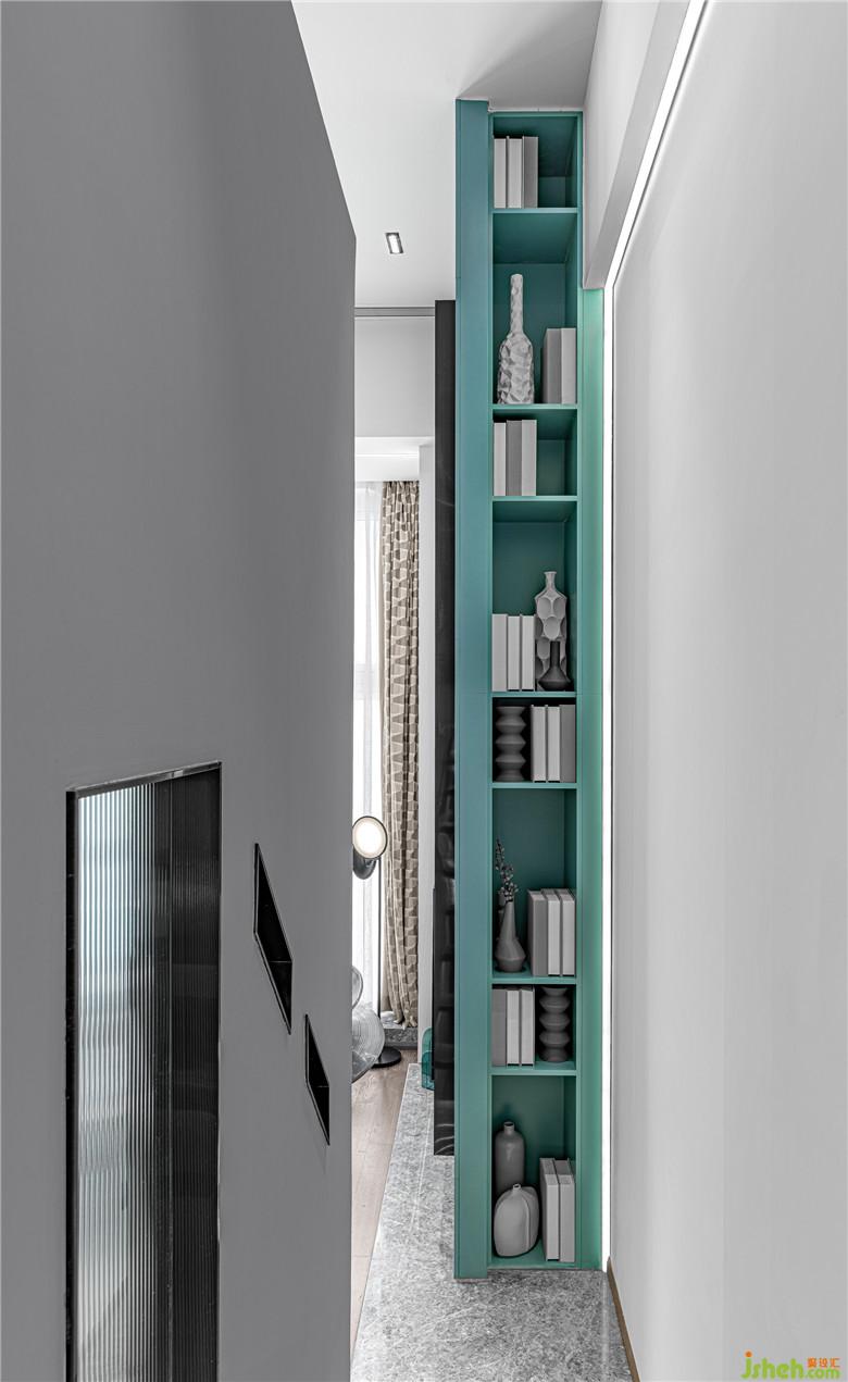 电视墙拐角处的收纳展示柜,由一条蜿蜒的灯带作线索,与楼梯另一端的壁柜遥相呼应。心爱的收藏,采撷的片段,被贴心的收纳系统细致妥善地安放。
