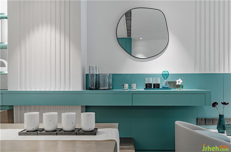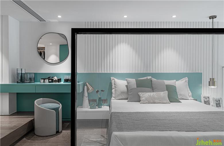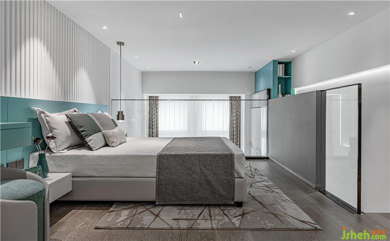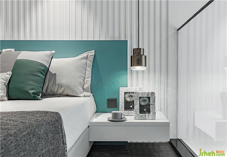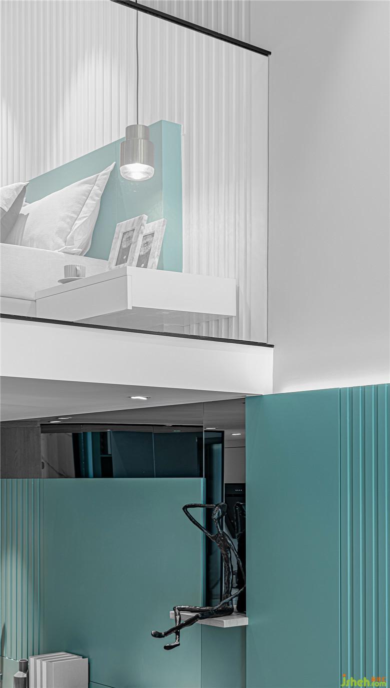 如果说下层的动区充满了流连的动感,那么上层则体现着色彩的静美。细框钢化玻璃的加入,使上下两层在户型特点下并不完全割裂,视线和动线的交互更为开放和轻盈。