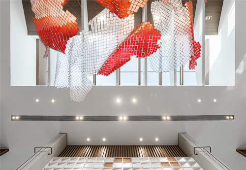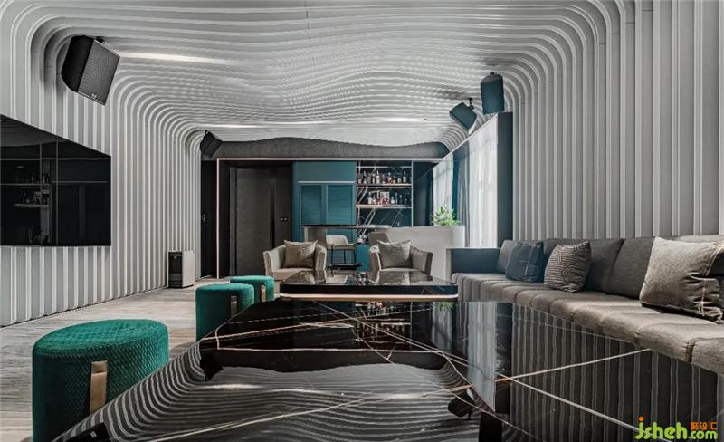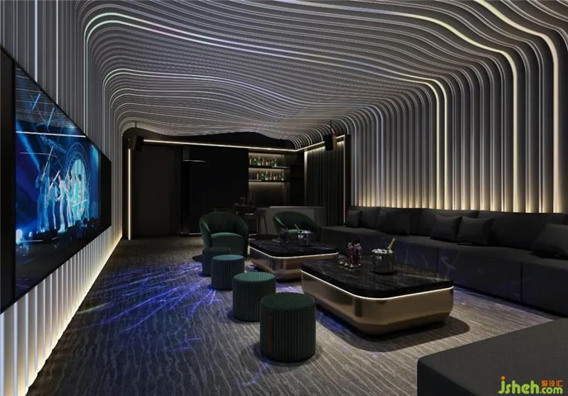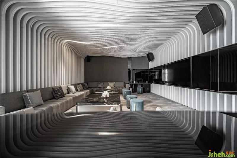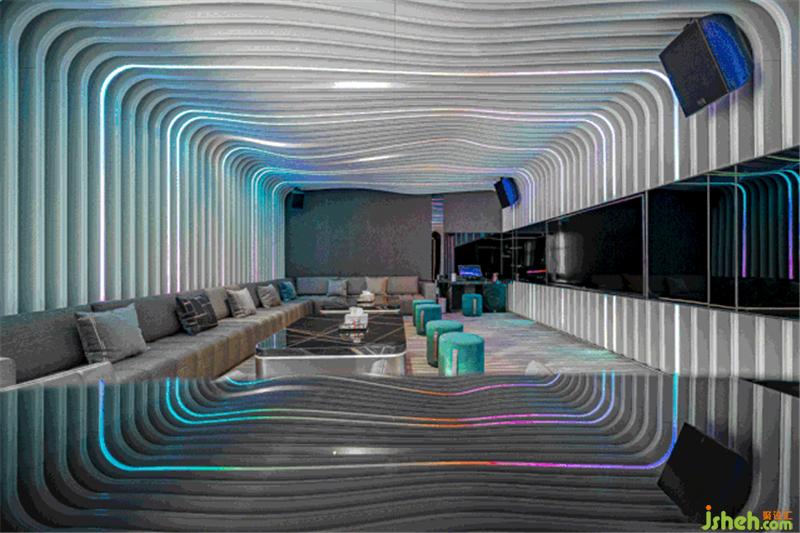 曲线属于现代的表达,恣意而随性。上层KTV套间经过重新改造,以流畅的流线立意,展现出冷峻迷幻的氛围。57根完全不同的曲线构成的流线覆盖整个KTV包厢的天花和墙体,如同波纹般款款地层层荡漾开去,大胆创造极具冲击的视觉张力,叫人眼前一亮。