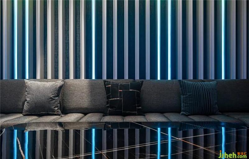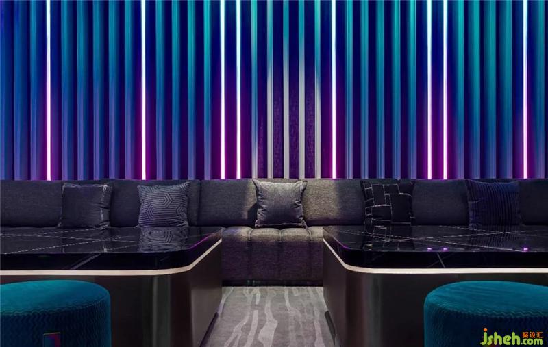 灯带镶嵌在曲线的格栅之中,随着音乐动态幻变出千百种渐变色彩。南昌会所设计如梦似幻的光影阵列倒映在黑色大理石桌面上,恍惚间仿佛创造了象征着时尚、未来、迷离的“时空隧道”。