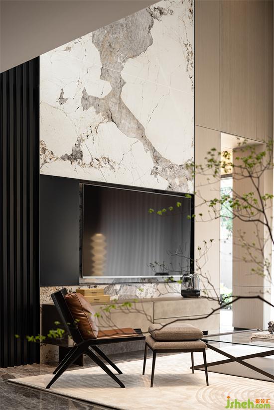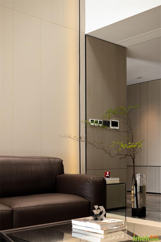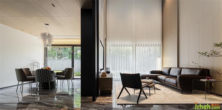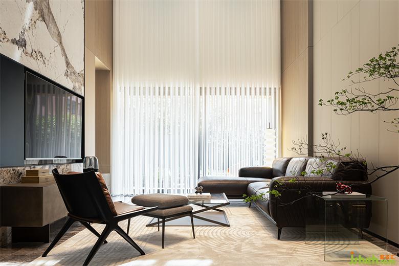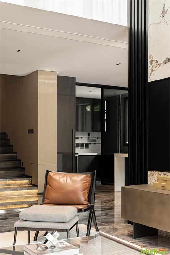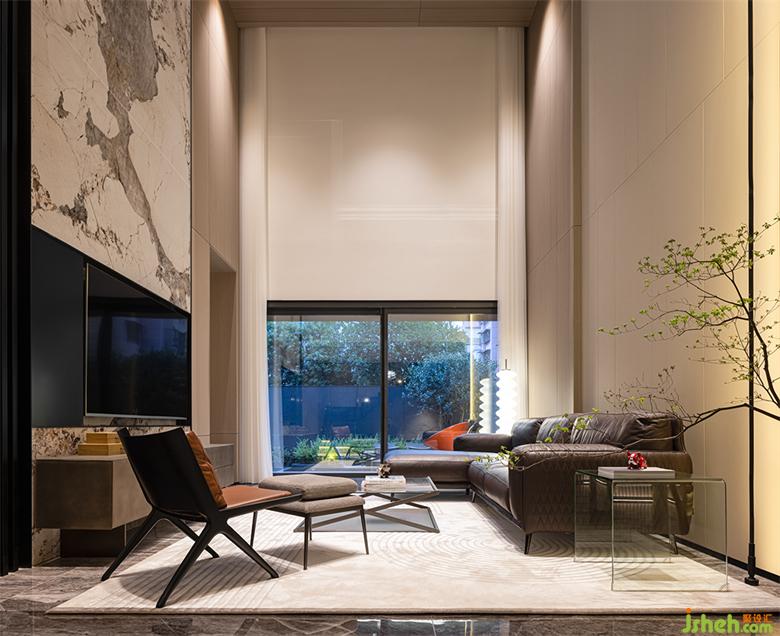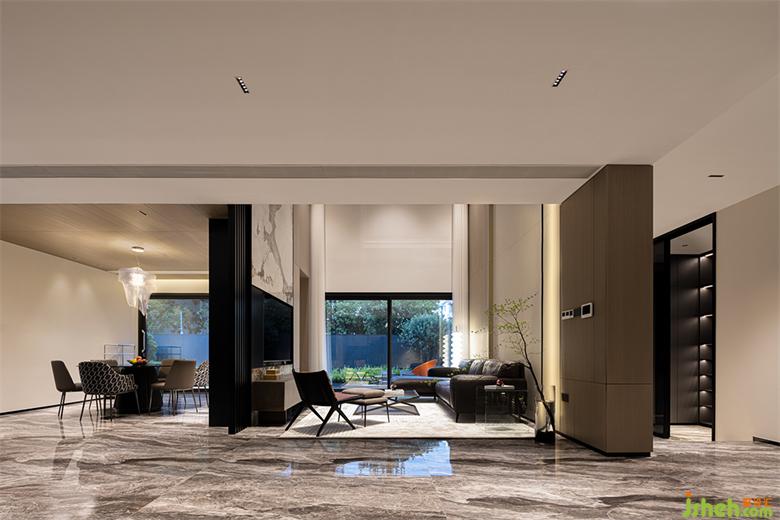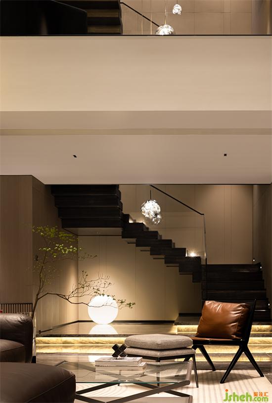 大面积的落地窗,现代别墅装修设计引入窗外的自然气韵。自然光与室内灯光相结合,各个时段的阳光以不同的角度照射进室内,留痕于沙发、地毯、茶几上,光影变幻中,呈现出安宁静谧的视觉画面。