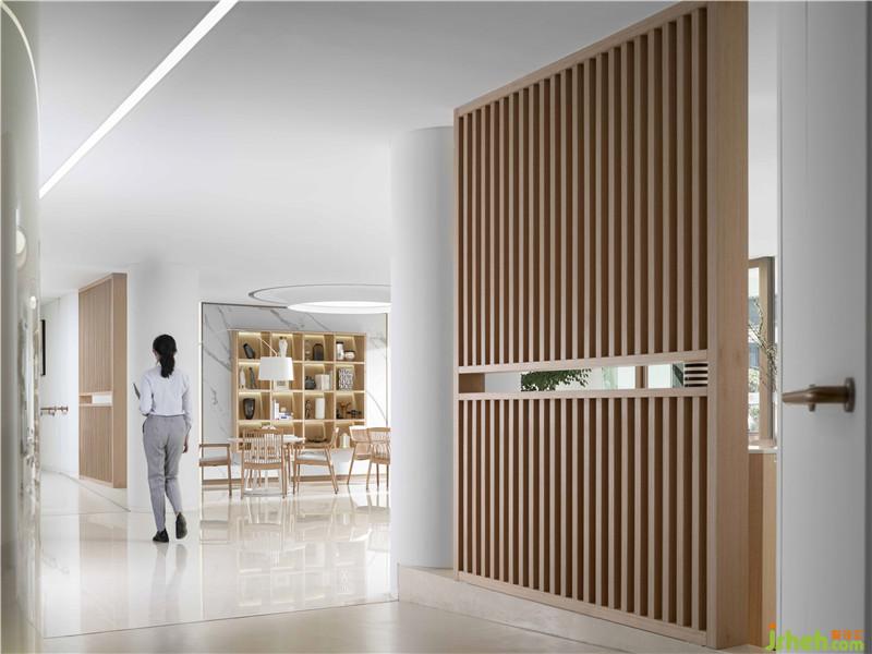初入空间,门斗以圆形的方式呈现,四分之三处位于室外,四分之一处则位于室内,既成为内外相互呼应的衔接,又以拥抱的姿态致意到来的人。