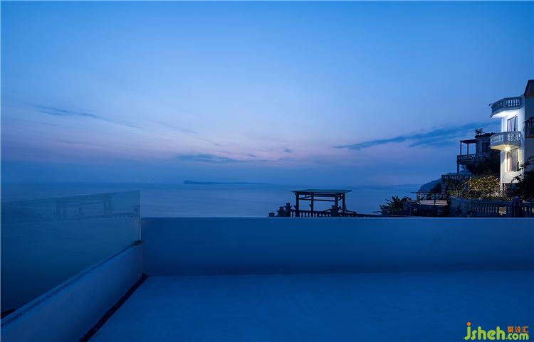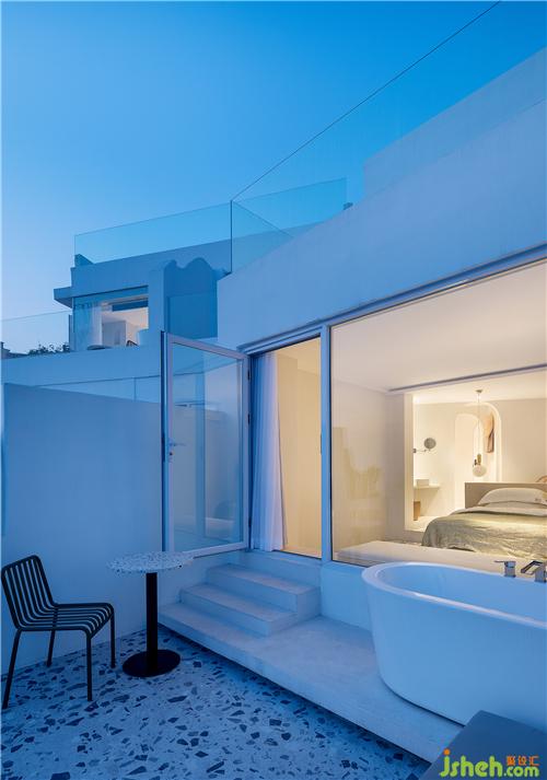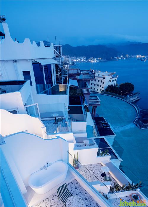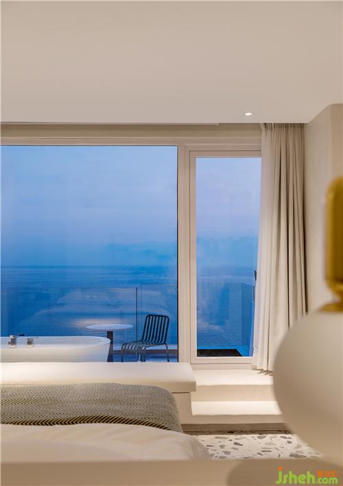 海与远天衔接,犹如一片无垠而繁茂的牧场,白浪闪着琉璃瓦的光泽徐徐涌来,近处错层叠落的白房子呼应着海岸线的叠石小丘……人在这样一片纯粹而浓郁的蓝色之中,感受纯粹的自然与色彩间流露出的澄澈与美好。酒店设计