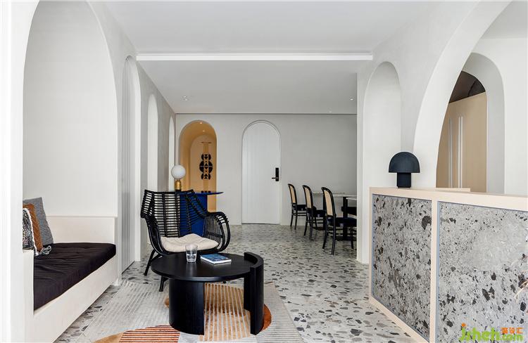 步入接待区,一众白色的墙面与随处可见的拱形门洞围合出空间布局,搭配上大理石细碎的花纹,让整个空间既柔美又带着庄重感。酒店设计细节上于当代主义中择善而取,运用手工编织草帽、布画以及民族风抱枕、挂件、地毯等装饰,作以承载情感与意境的美学表达,使得野趣灵动的气韵在空间中转意迭出,共同勾勒旅居生活的美学质感。