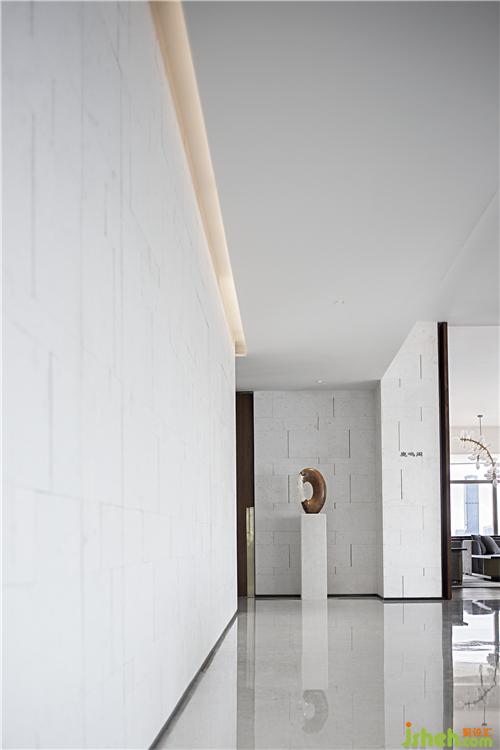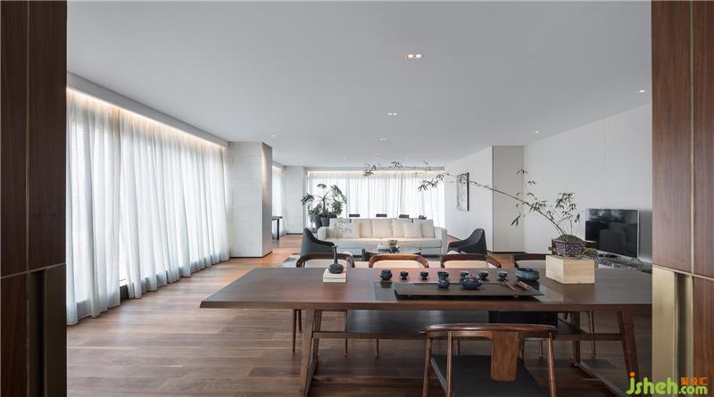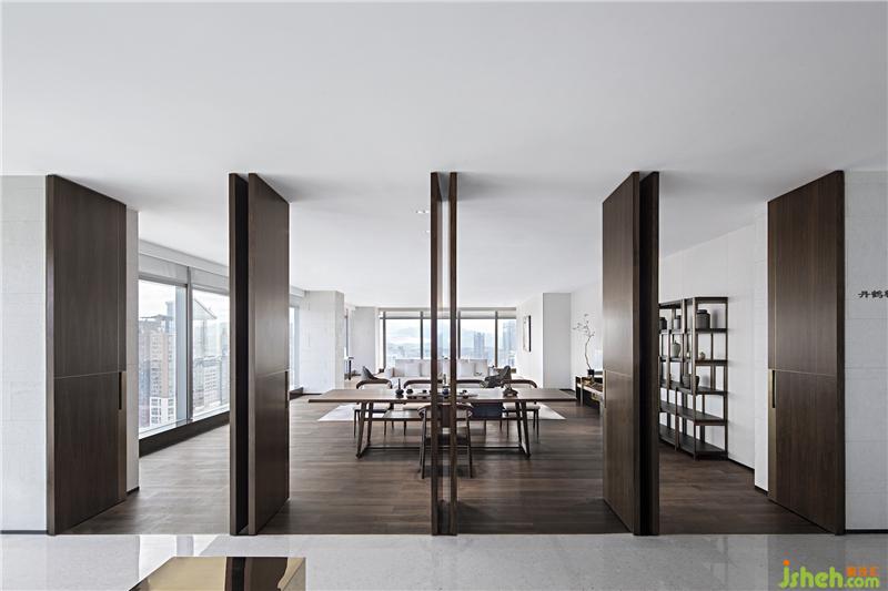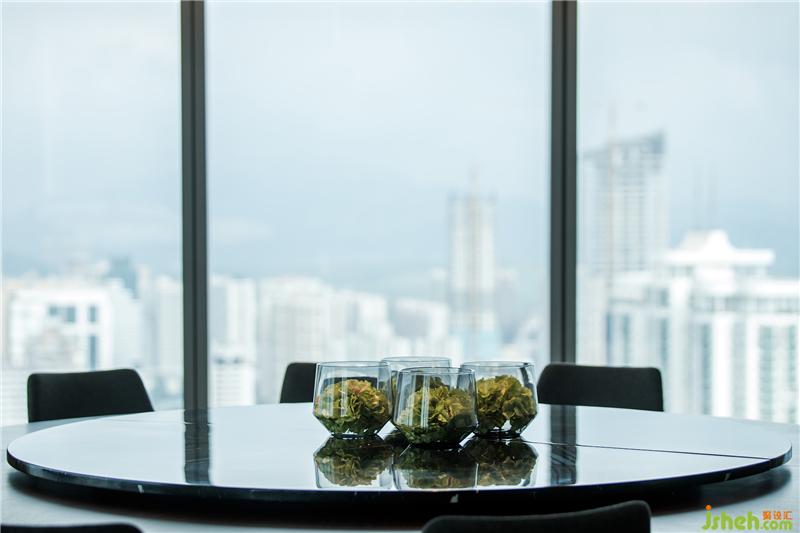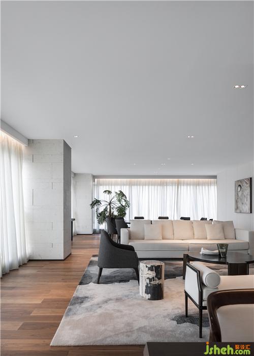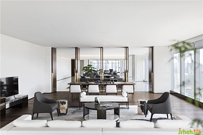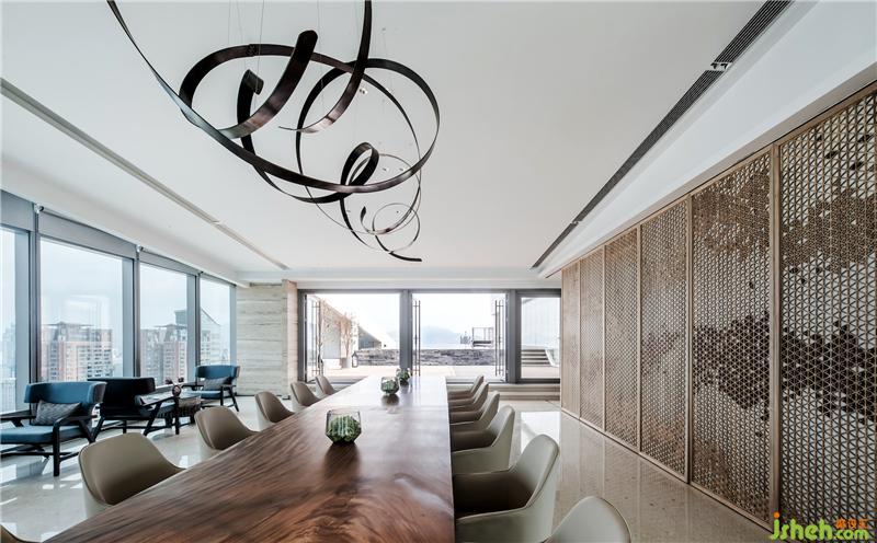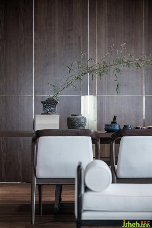 素朴的木艺,经由现代工法的演绎,成为极具当代气质的墙面艺术装置,搭配浅色调布艺沙发、水珠状艺术灯饰,呈现出纯粹而有序的空间气度。空间的纯净与窗外深圳的都市景观形成对话,设计师以独特的视角凝注天幕之上此时此刻的曼妙,予人以独特的观感。