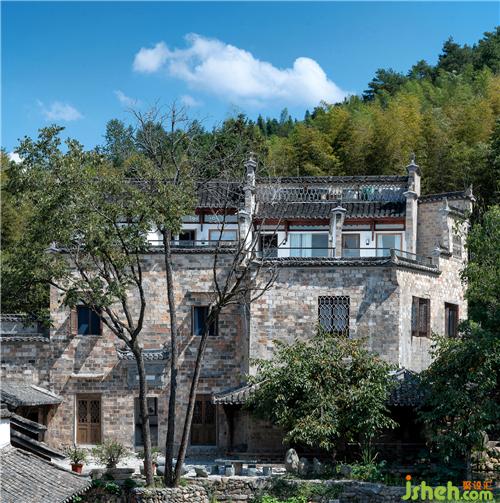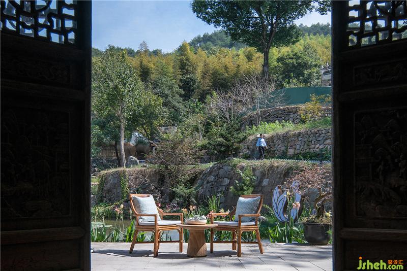 酒店由七栋不同时期建造的徽派建筑组成。建筑实施保护性修复,做到修旧如旧并保持徽派建筑独有的砖雕、石雕、木雕来做装饰。利用地理优势将山间小溪引流,经过酒店每栋建筑最终汇聚堂前形成一波清池。酒店设计