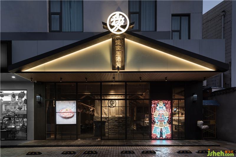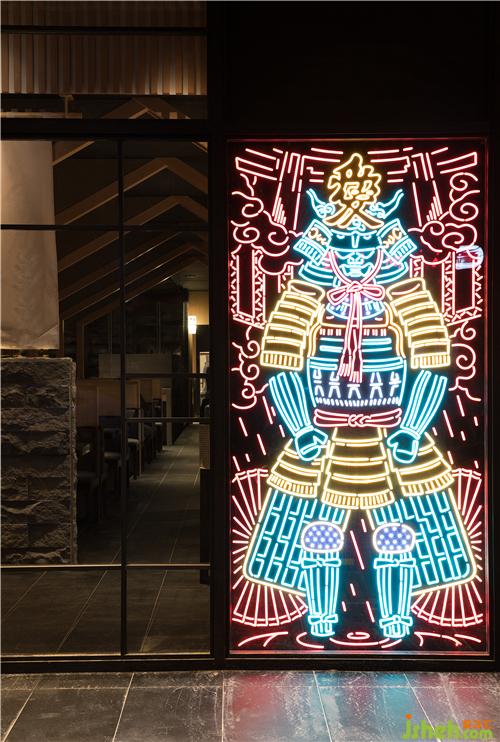 三角构造的坡屋顶与霓虹灯武士像,于入口处勾勒出独特的日式风情。通透的落地玻璃串联内外,亦令路过的行人在街头夜色下窥见这座深夜食堂的美好。