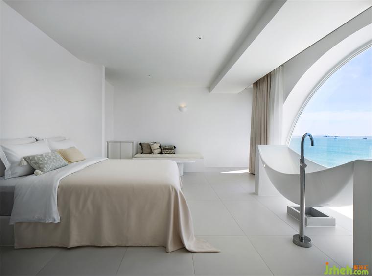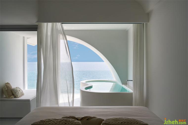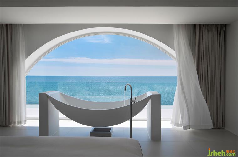 面朝大海,心怀澄澈。设计师最大化地引入自然光、海平线,以严谨的美学尺度,透过不同家具的高低差,营造人在多种视角下对风景的细微感知,当人们躺在床上时,望向窗外的视线与海面齐平,精品酒店设计随时欣赏波光粼粼的意境,唯美而空灵。