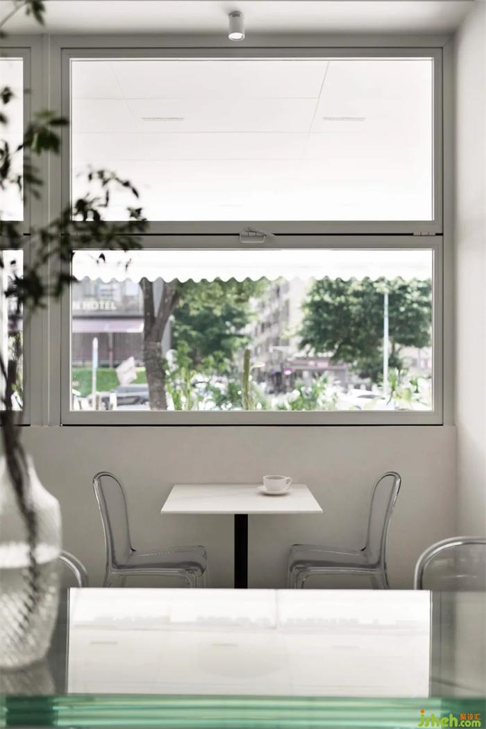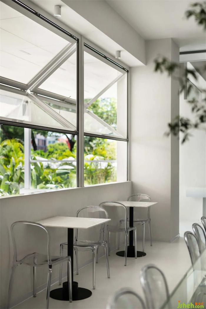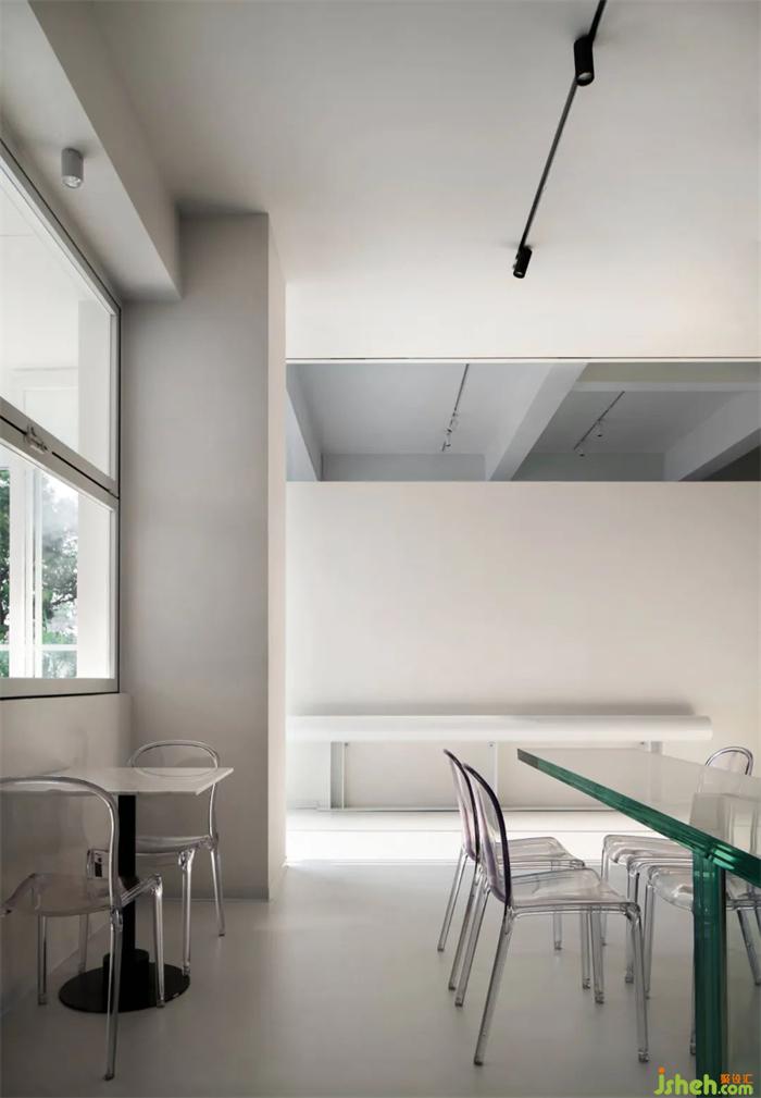室内空间以大面积的白色充斥两个方盒空间的嵌套结合关系,并通过高差打造垂直纬度的丰富体验。对于当代都市人群的生活预设,咖啡不仅代表了一种生活态度,更是一种工作方式的延续。餐厅设计对于冗杂工作间的厌倦,使得人们转向寻求更有良好体验的空间。