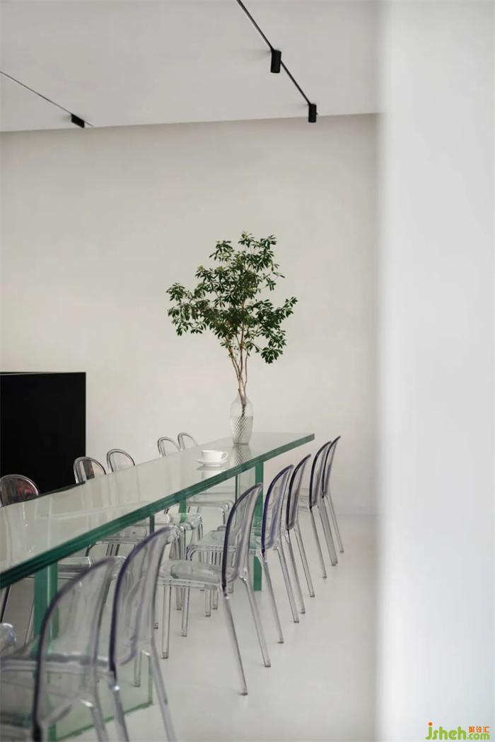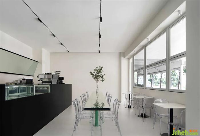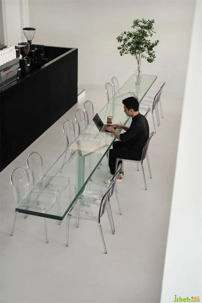 主空间中央的玻璃长桌,通体透明的硬朗形体透露着工业时代的冷峻与严谨,味匠咖啡厅设计而亚克力椅子的柔和曲线中和了其中的疏离,使得人们共处方式更加开放多元。人们可以在这里视频会议、活动交流,充分表达自我,联通外部世界。