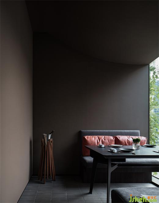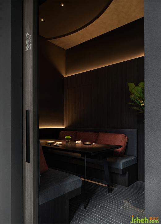 木面从立面延续至内部,流畅且具有整体性。灯光从角落缓缓均匀漫出,从家具和隔墙下方弥散至表面。食客面对绿意而坐,枝叶与光线形成阴翳。环境雅致,千年隼日本餐酒馆设计营造舒适用餐体验。