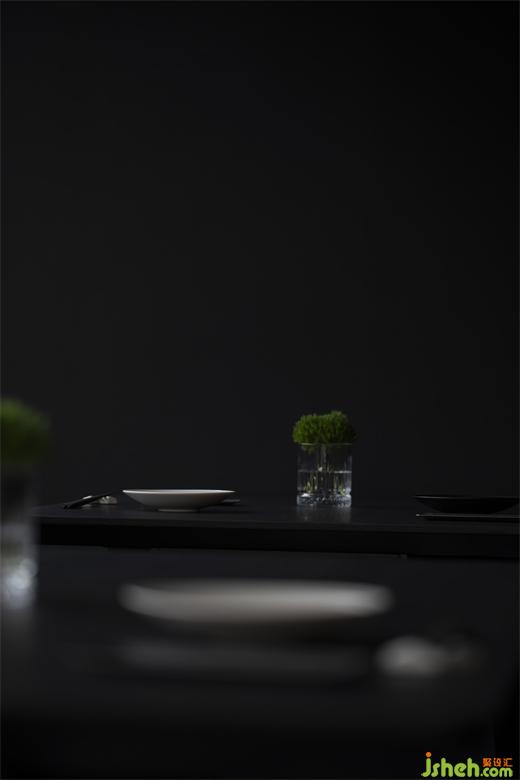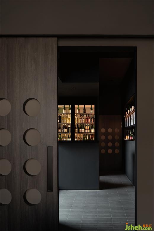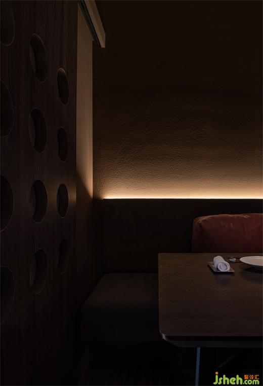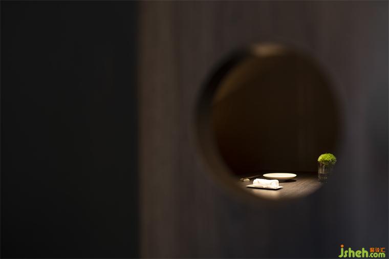 隔断门上设置了一些圆形小孔充当透视孔,小孔将外部场景投射到对面墙壁上,千年隼日本餐酒馆设计让客人感觉仿佛进入一个“暗箱”。偷偷一瞥室内景象,光线顺着孔洞照射进来,照亮一桌美食,犹如一幅静物画。有限的装饰,却引导出无限的空间想象。