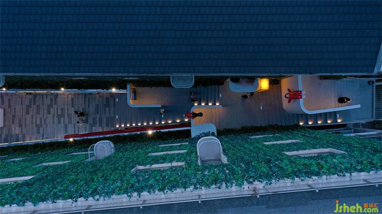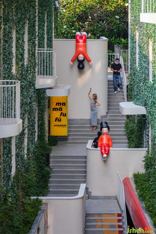 在设计者根植于在地文化所营造的商业街区中,其颠覆了原有街区的尺度与形态,采用层次化、递进式设计让街区变得丰富起来。溯源而上,上海M+马利 mamǎfufú超级百货设计者以颜料工厂旧址思索而来的红黄蓝三原色灵感,串联起了整片街区。