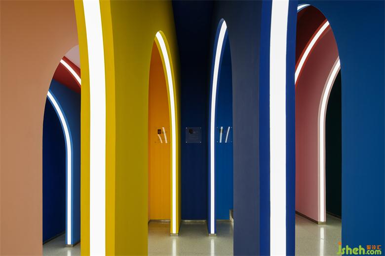 红与黄的跃进传递了一种激进的氛围。上海M+马利 mamǎfufú超级百货设计在纯色线条勾勒与体块覆盖中,原本沉闷乏味的电梯厅被这种极简表达所提振,焕发出一种明媚的美感来。