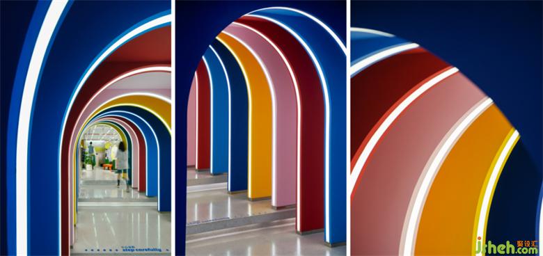 作为复合型空间形态,即使是不同的功能体之间,上海M+马利 mamǎfufú超级百货设计亦给予了一以贯之的统一性与无间过渡性。在由颜料店到书店的过渡走廊,色彩的统领理念,以彩虹拱门的复迭形态,瞬间点亮了原有的平凡,行走动线上的仪式感与视觉冲击扑面而来。其颜值与形态,可谓打卡出片的不二之地,潜台词里写满了设计欲引发自动传播的商业赋能理念。