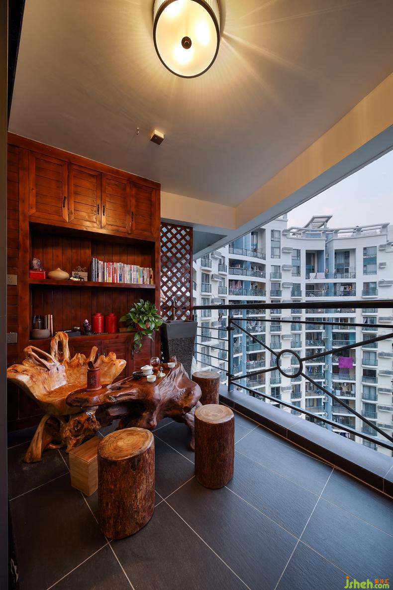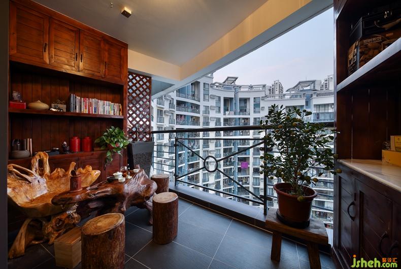 业主是热爱中国文化的人自然也是一个茶痴,景观阳台被改做一个小小的茶室,左右两边的实木柜子摆满主人的收藏的好茶,一樽樟木木头做成的精致的茶桌,一张造型夸张的摇曳木头椅子闲来无事,烧水煮茶,可邀亲友共叹、同赏窗外风景也可自己一人享受这静谧时光,人生如此,夫复何求!