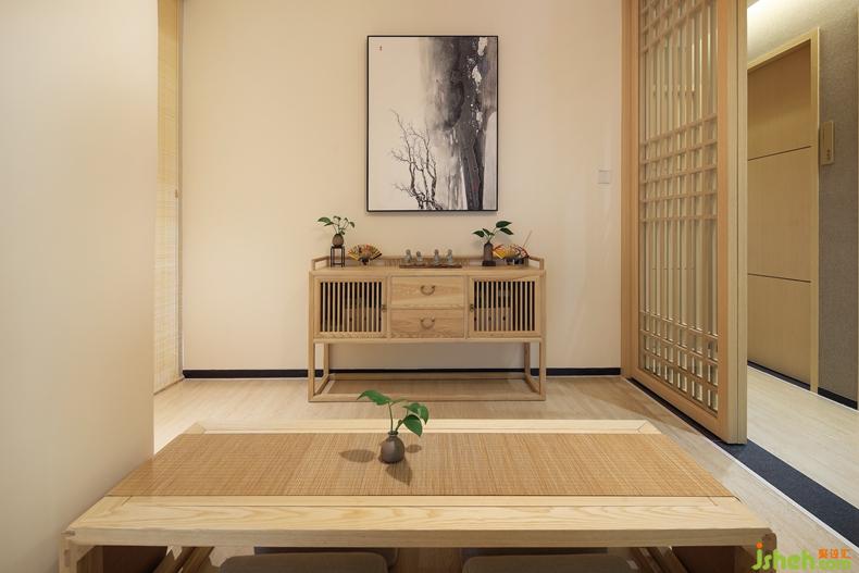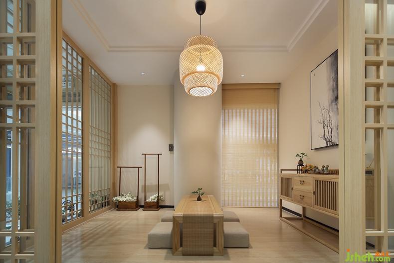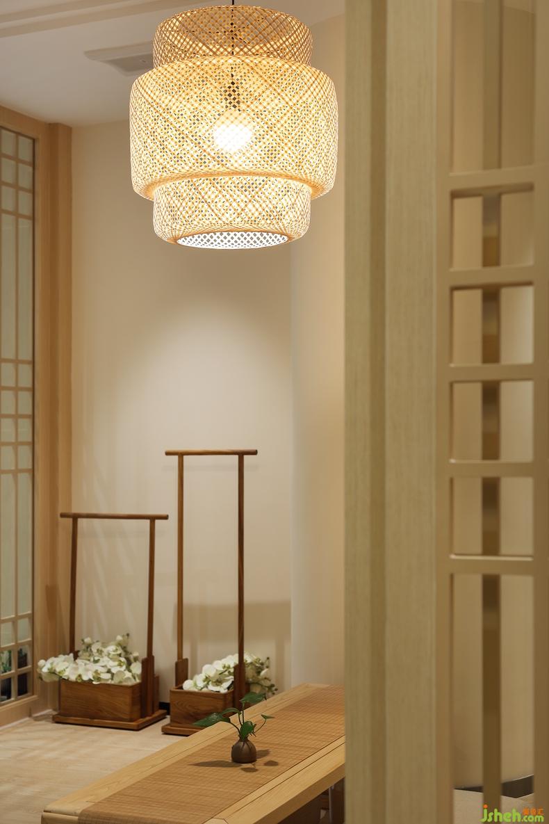 竹编灯笼外形的吊灯、和风矮木桌、舒软棉麻榻榻米、角落处是两个古色古香的木制方形花篮,一大一小一高一低,深圳室内设计师艺术感非常强烈,静态的画面里,却又有了动态的活力。