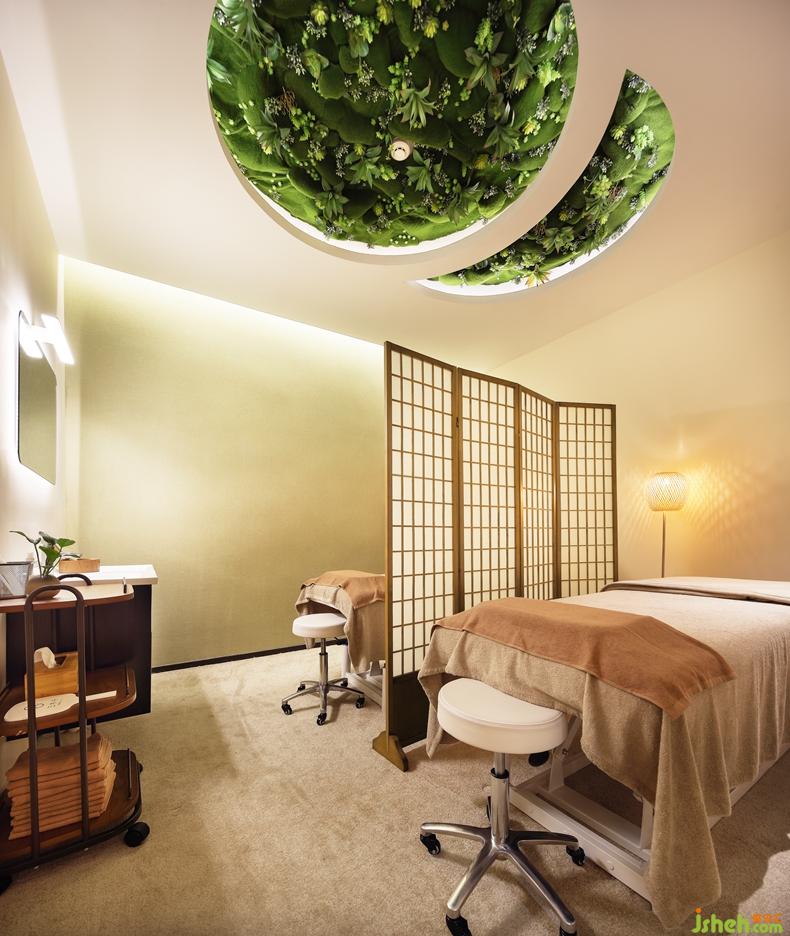 美容室在设计上最亮眼的无疑是天窗的设计,里面用绿色的植物装饰,躺下来,或抬头便是一座大森林透过窗口映入眼帘,清新的气息扑面而来。深圳室内设计师让在享受美容服务的同时,眼睛和心灵都得到大自然的治愈。