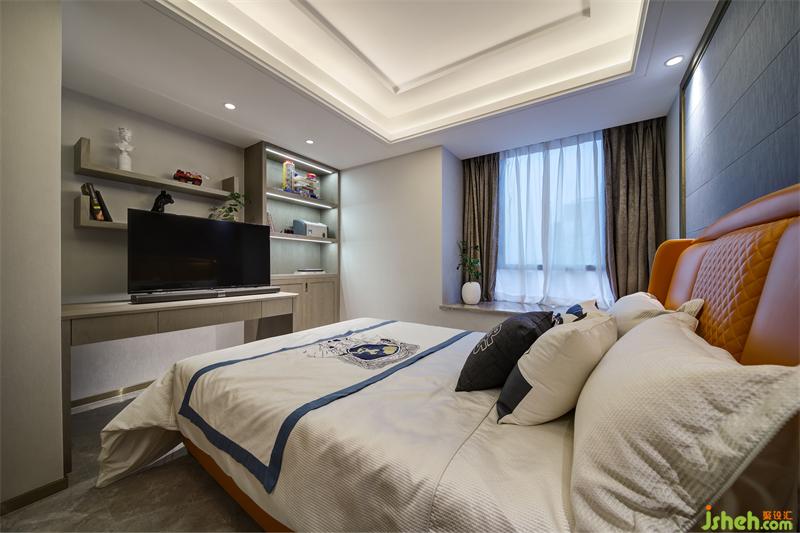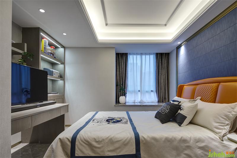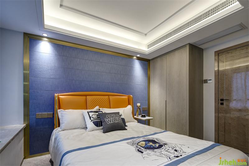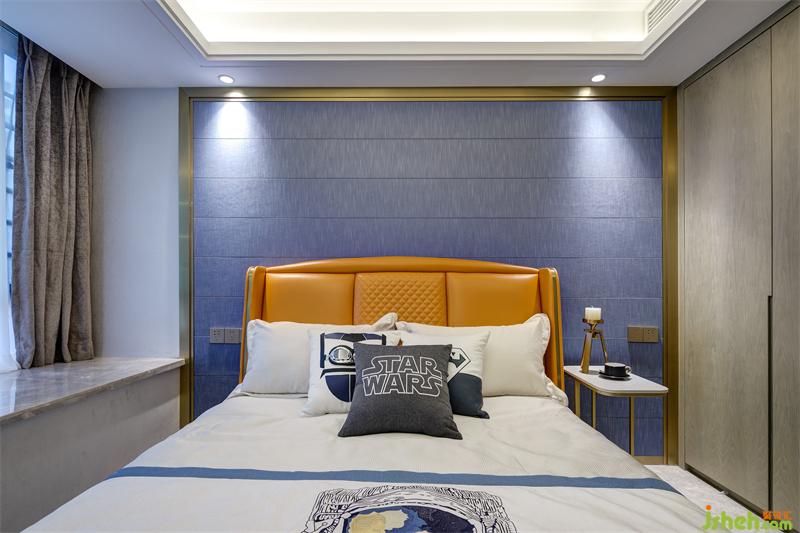 床头采用爱马仕橙,有着黄色的明媚,红色的艳丽,就像洒在海面的阳光,现代轻奢设计酸酸甜甜的橘子一般,视觉感超级暖心,背景墙采用灰蓝色,给人一种面朝大海的清新。