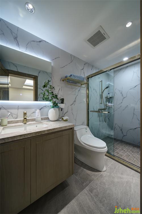 整个卫生间以香槟金做为辅色,显得整个卫生间不那么的单调,但优势在于浴室柜,下面带有橱柜可以更好的放置隐私物品,当然也可以放日常用品。