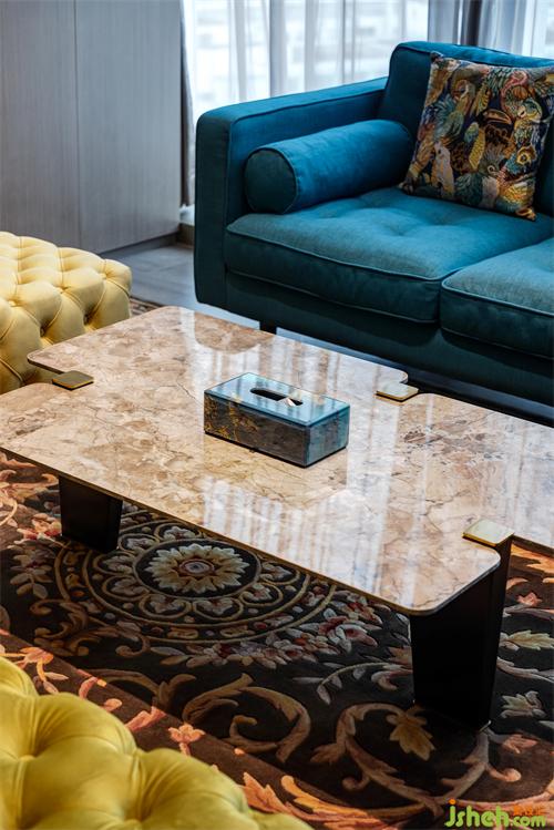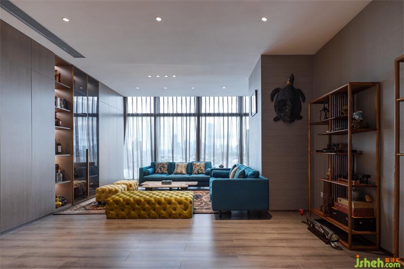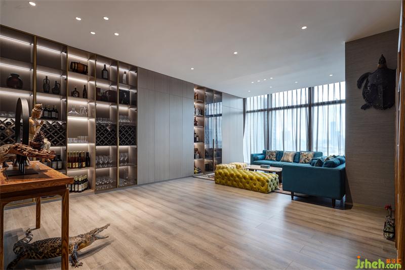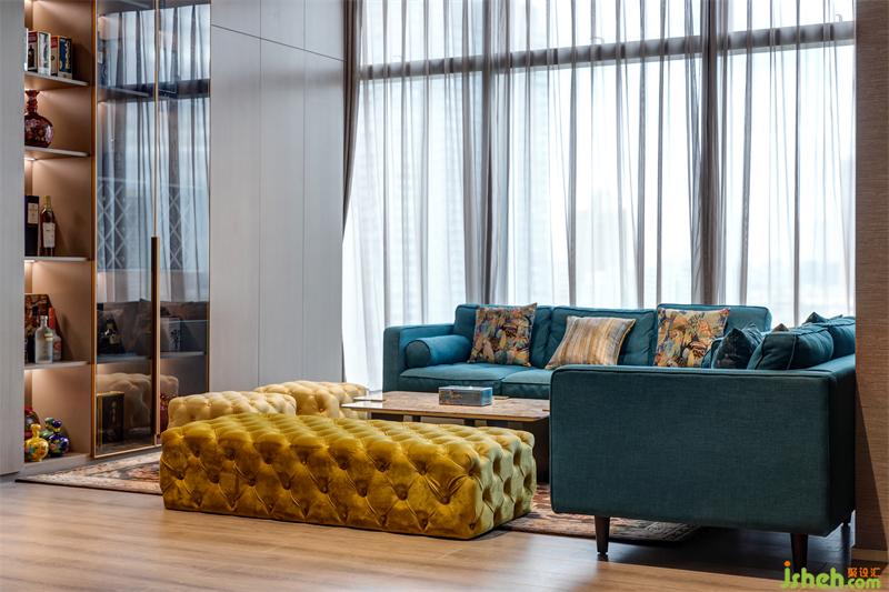 湖蓝色和黄色的沙发,让红酒房的颜色丰富起来,而不至于太过单调。家居化的空间,消弭了人与人之间,人与空间之间的隔阂,在这里坐下品酒聊天,犹如家常,岂不快哉。