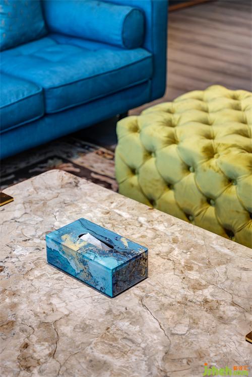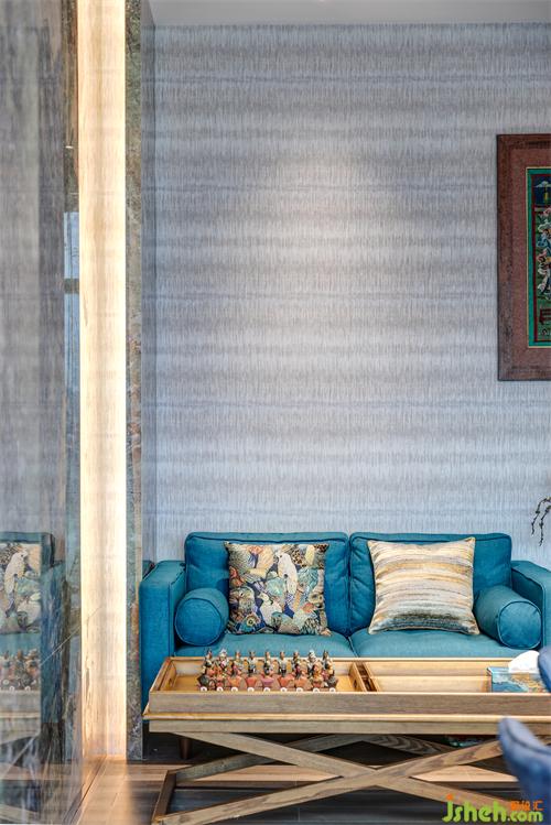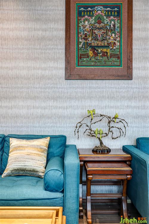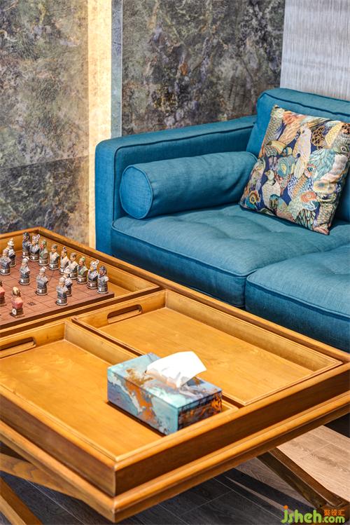 中式风并非古板的厚重的,也可以是时髦的,文艺感的。湖蓝色沙发、精美的水陆装饰画还有木桌棋盘等等,深圳办公室设计共同营造出温柔清雅的氛围,古朴静谧中带着俏丽灵动。