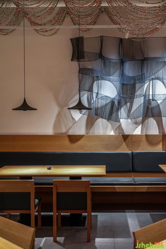 只有“农居”的概念,还不足以体现南方的乡村状态。没有水,“桃花流水鳜鱼肥”、“舴艋为家西复东”这些“水乡”的意味就完全无法表达。在本就不大的营业面积里做出一片水,不讲这种“论画以形似”,以实对实的效果是否能如人意,在寸土寸金的商业空间内,业主大概也不会同意。因此设计师采取“意象”的方式,以创作的装饰艺术品作表达,用金属和塑料这类工业化的产品重新建构农业社会的记忆。它带有一种无可奈何的讽刺的意味。