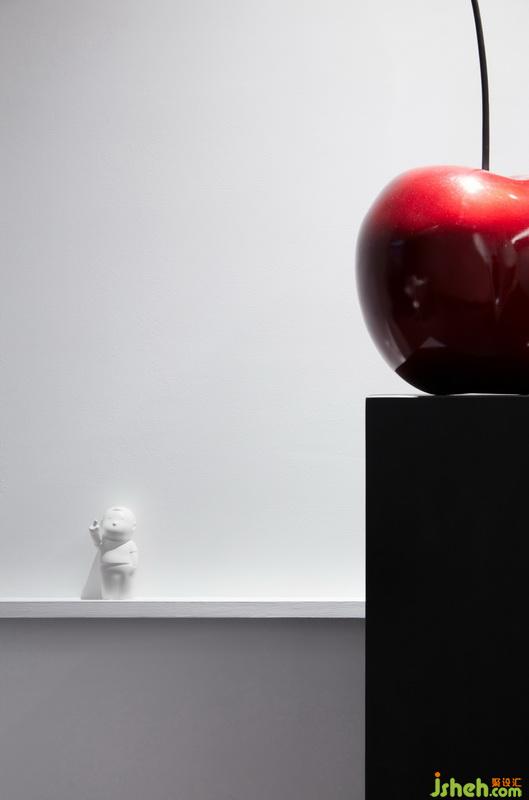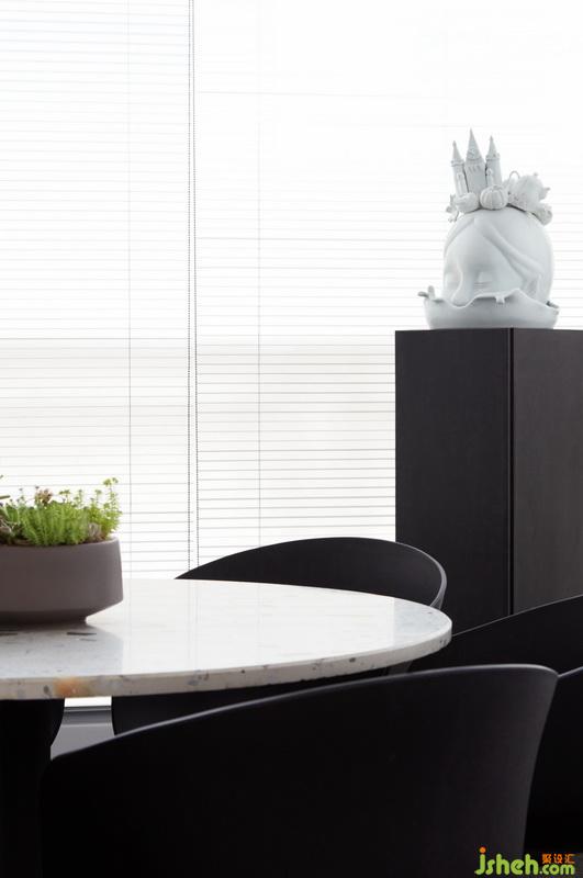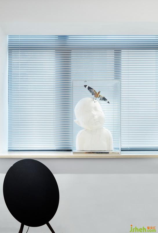 作为办公空间前区(公共区域)的设计,设计师在空间中置入了一个向四面伸展的爆炸形装置,如同一个多个方向的漏斗,连接着各个不同的功能空间,成为交通核的同时又为各个空间提供釆光与通风。倾斜的黑白构图打破一些平衡,形成一些视错觉,活跃了空间气氛。