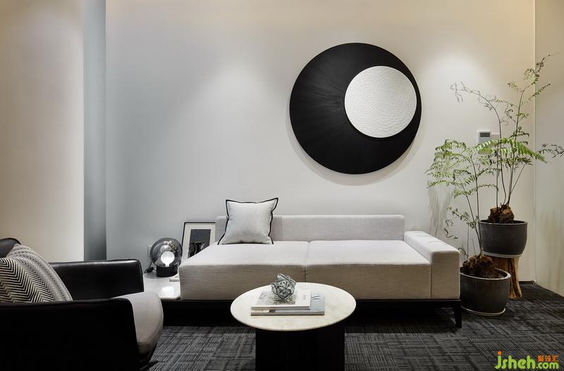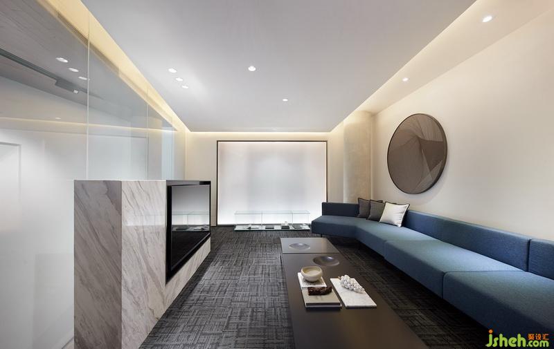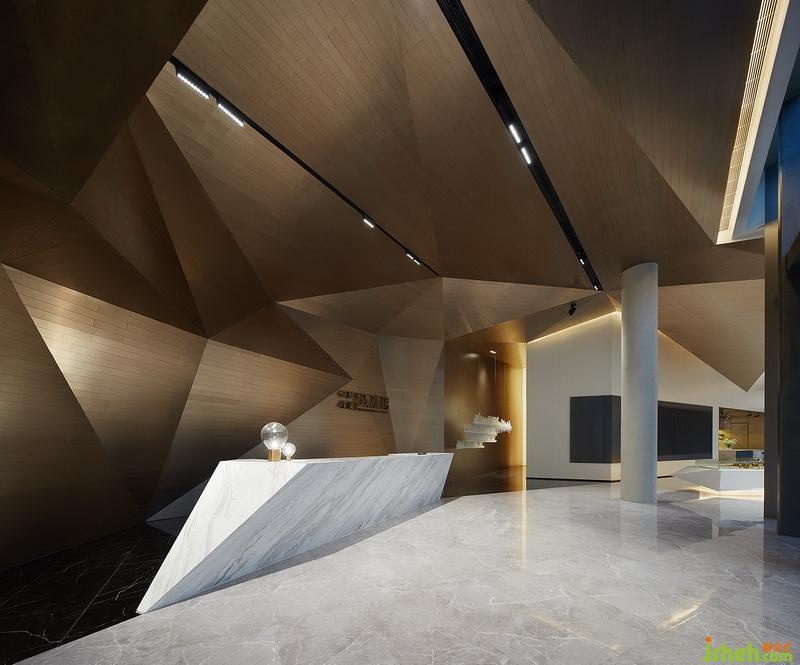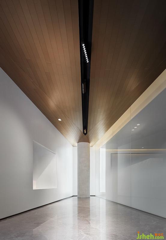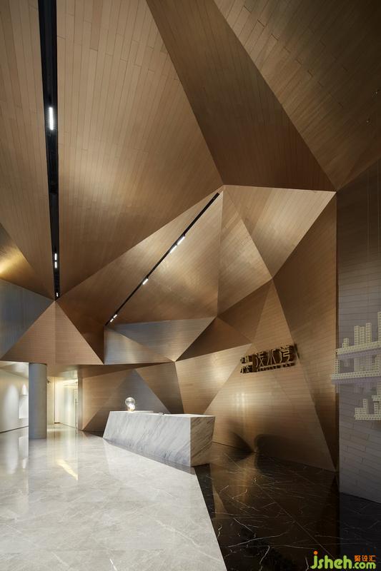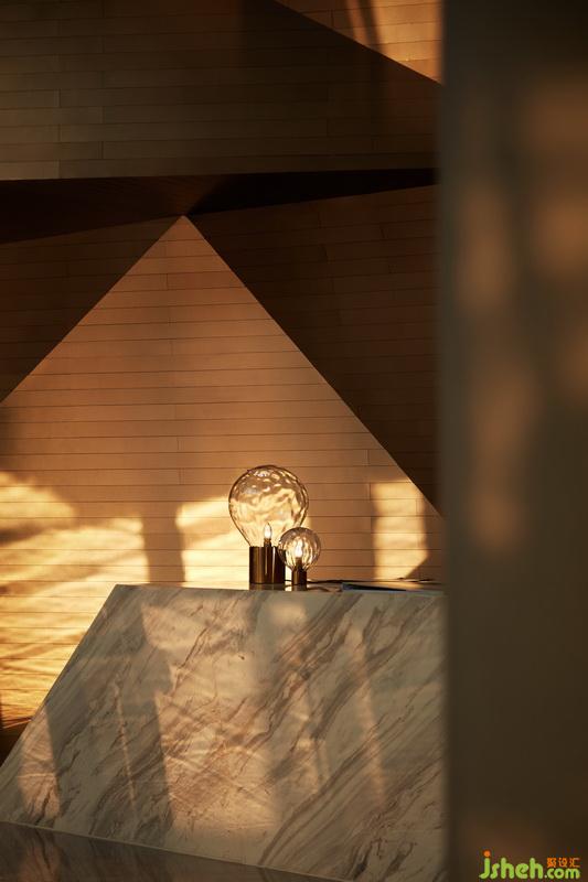 在这个框架内,设计师结合基础空间的特点,把注意力集中在天花和地面,将之作为表现的重头部分,以颜色有微妙变化的暖黄色调为基础,将天花解构成大小和角度多变的体块,既是协调统一的整体形态,又在不同的角度呈现各自所有的个性;而将垂直面只作规矩的大块面分割处理,既能简洁轻巧的展现空间秩序,又与天地形成明快悦目的疏密关系。