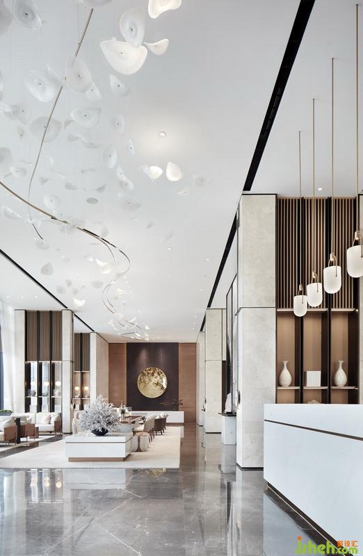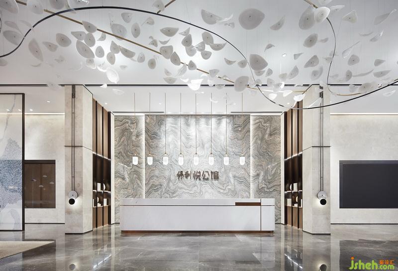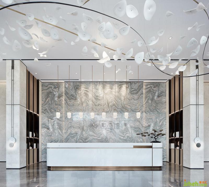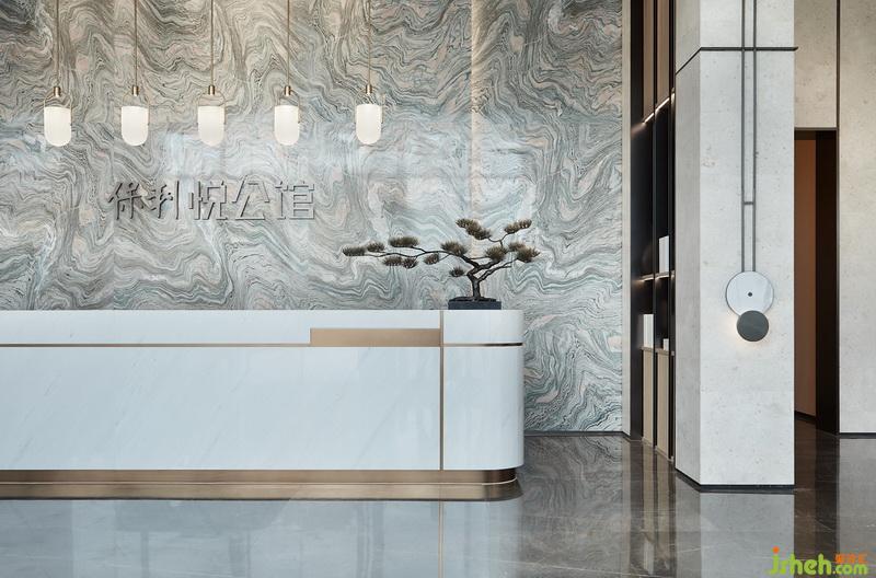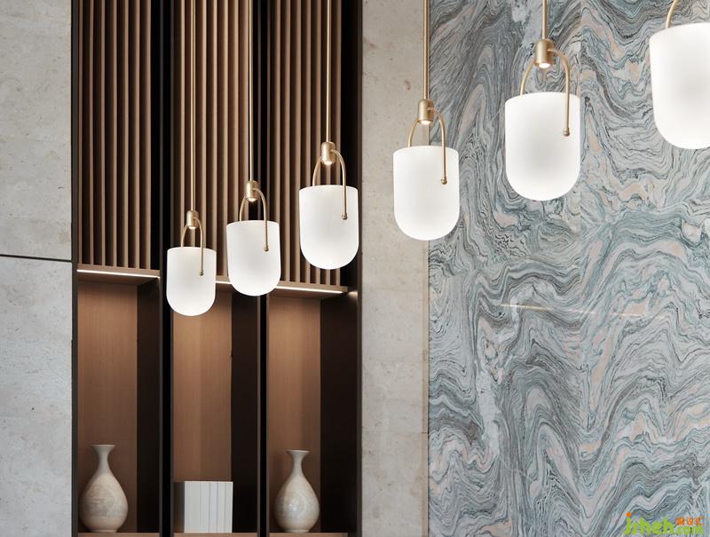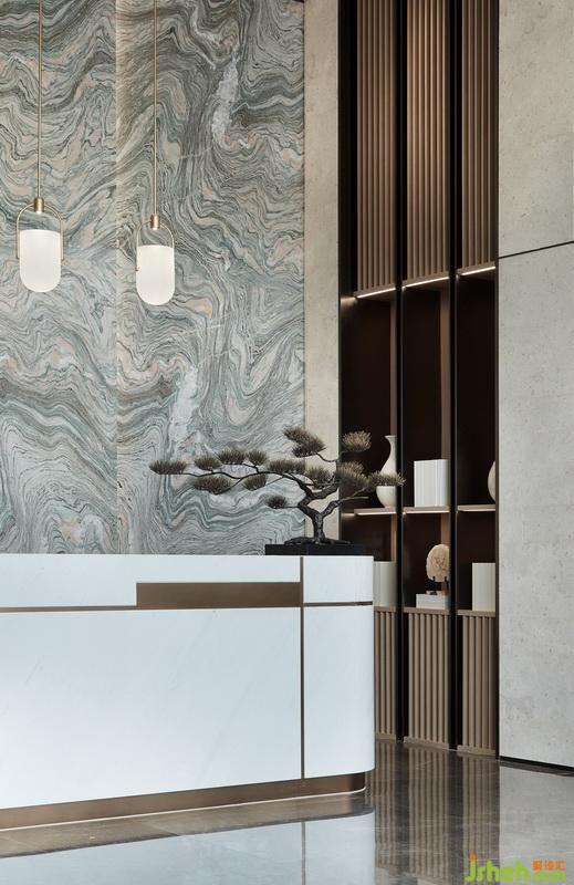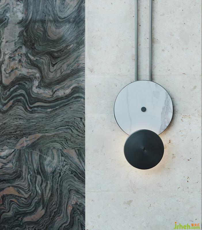 主要材料:水云纱大理石、达芬奇大理石、棕仕啡大理石、木饰面、深灰色打砂不锈钢