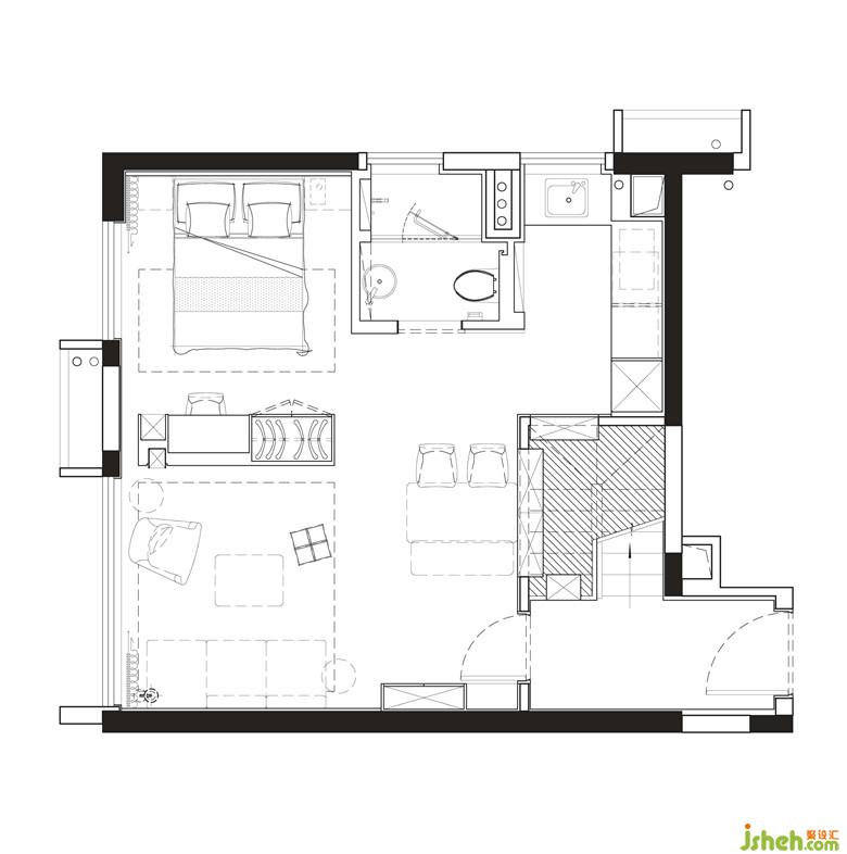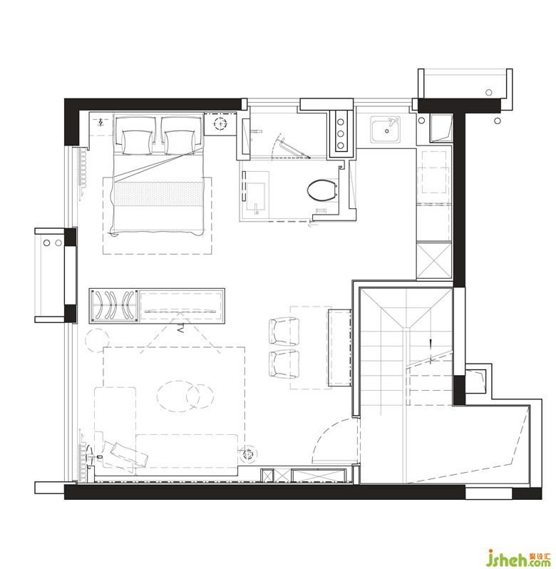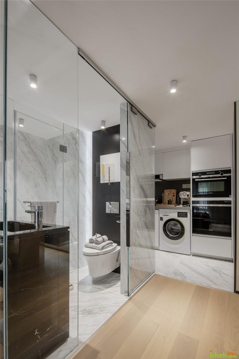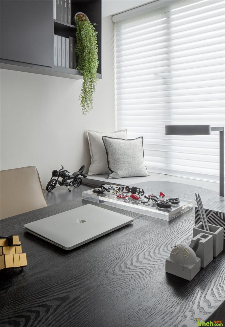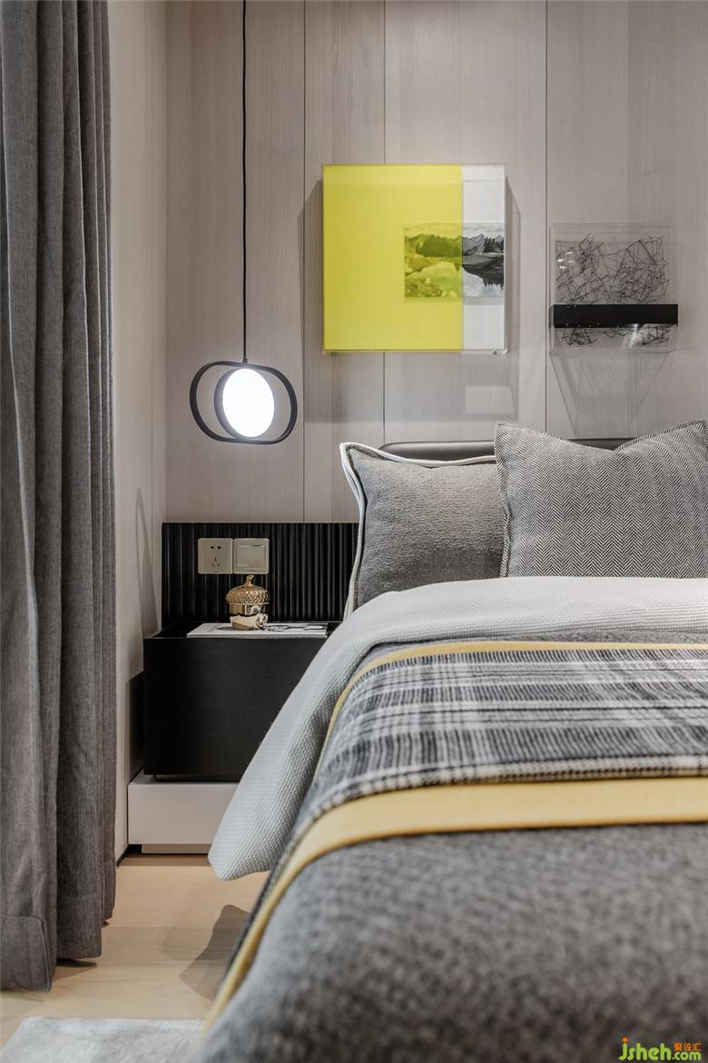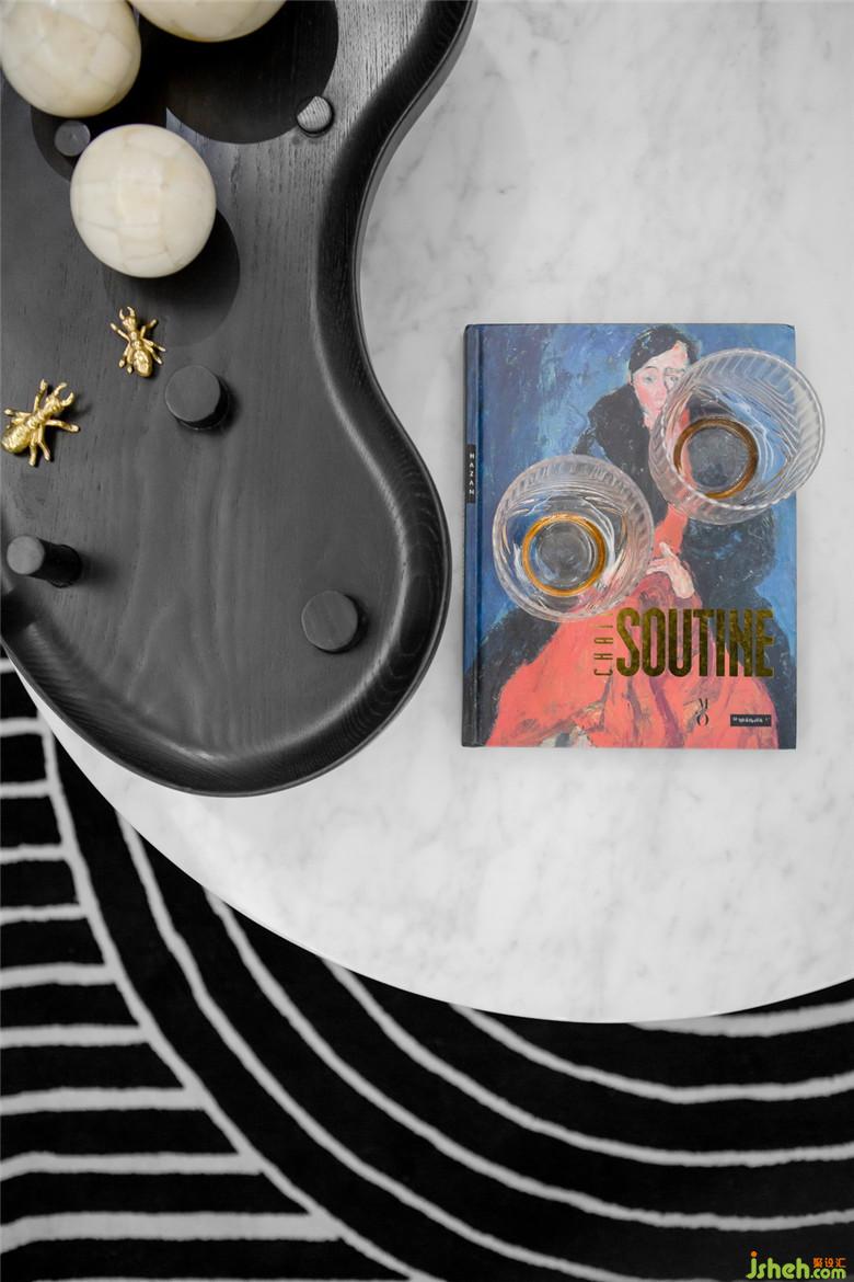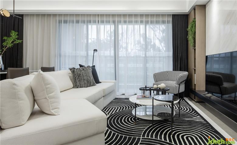 作为这三套样板间中面积最大的一个,空间以深浅不一的灰与白作为基调,线条明朗而直接。软装通过线条的改变来打破空间原有的稳定,弧形围合的茶几,不规则的沙发,与大面积圆形交错的黑白地毯,碰撞出一种微妙的平衡感,敛去了方正空间的沉闷。