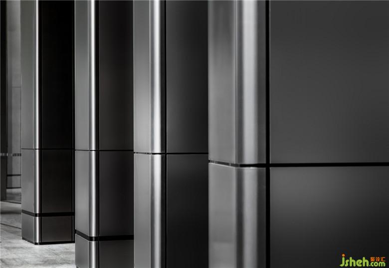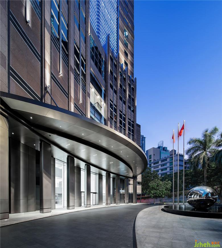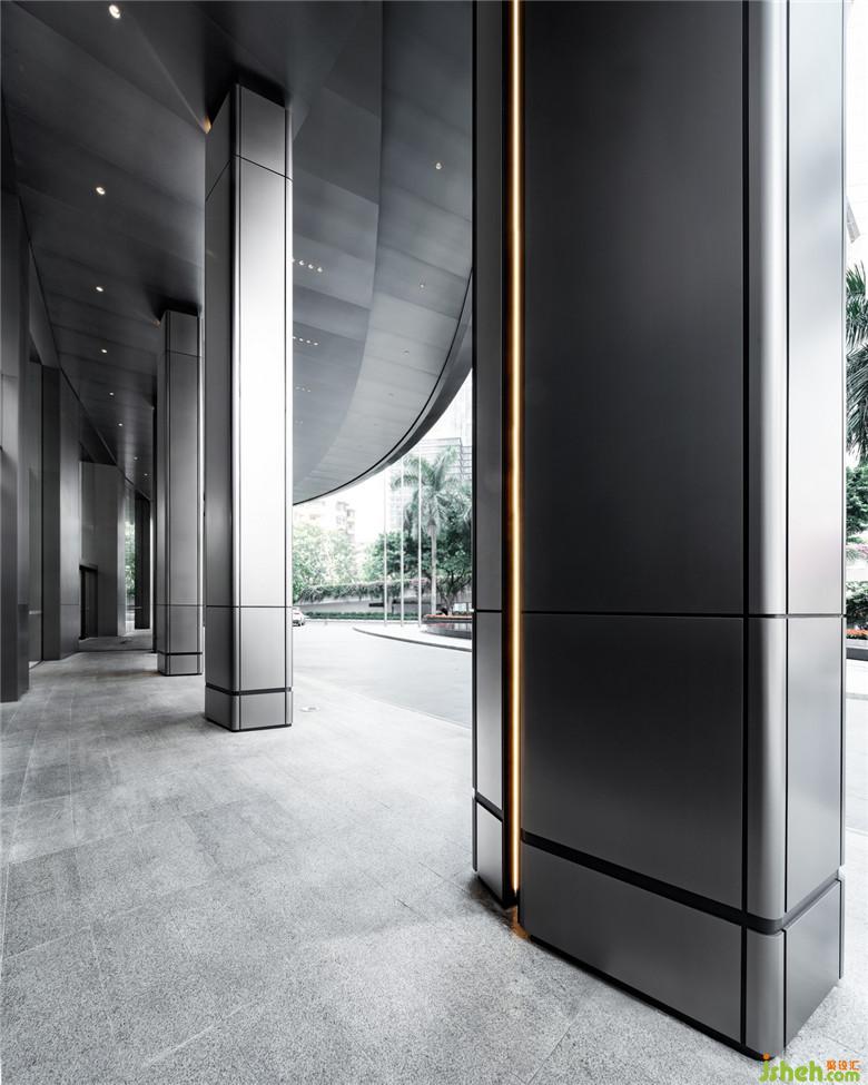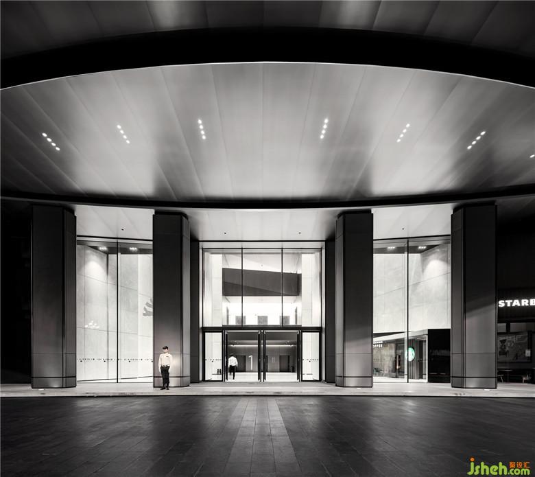 立柱之上雨篷则被重新设计,简洁的弧形结构替代了原本的玻璃雨篷,结构的简化让它与大厦主体间的衔接更加自然,融为整体。同时,半圆弧形结构向两侧的自然延伸带来了更多的覆盖面,为遮挡功能带来提升。