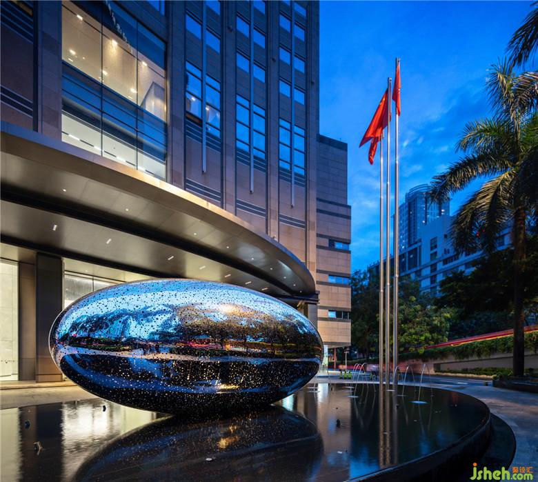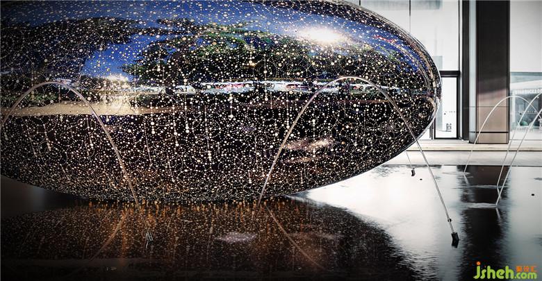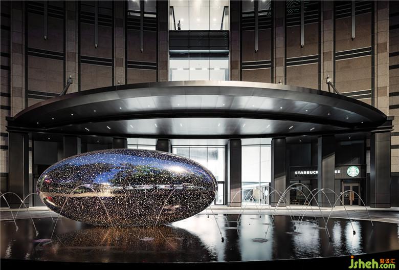 一楼大堂门前的巨蛋雕塑,源自艺术家Lindy Lee,6米不锈钢材质的体量感,不容忽视,通体布满细小的孔,黑暗中,它们会穿透蛋壳,投射出星辰般的光芒,让人看到有无限的能量在迸发。如果说这栋大厦曾是一个过往的城市象征,那经历过重塑后的它,应当是“孕育”在蛋壳的一束光芒,继续点亮门前这条大道。