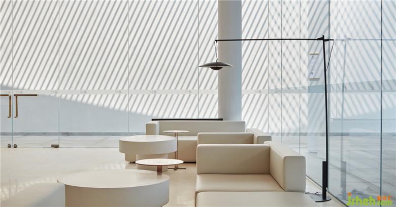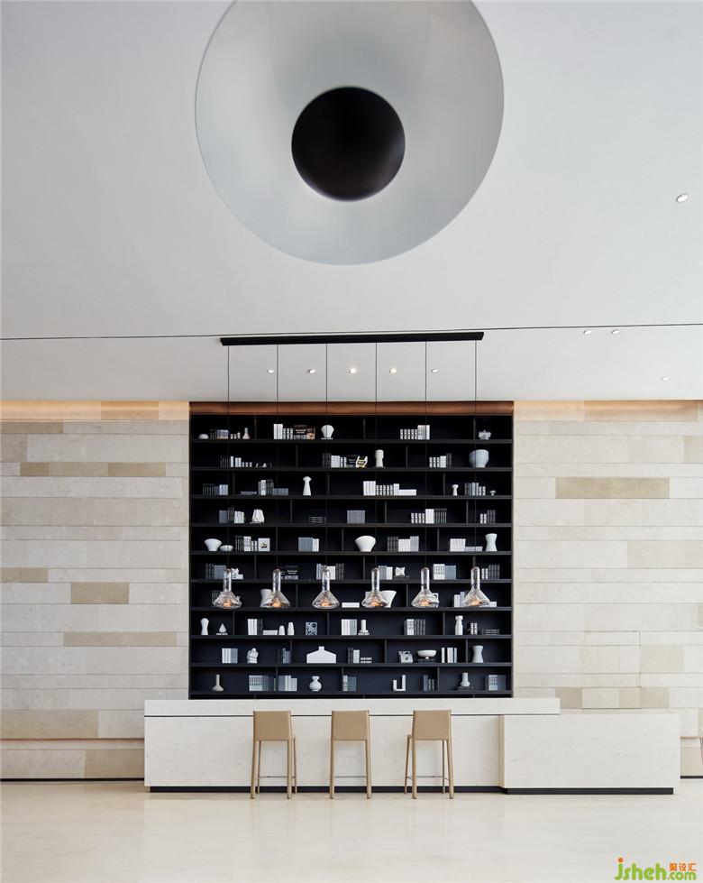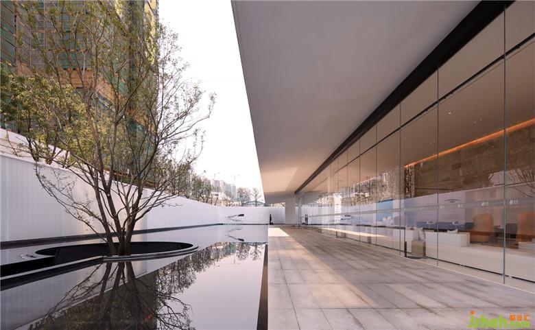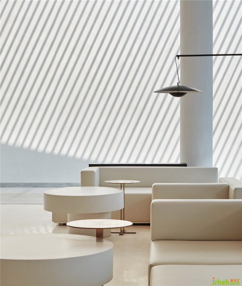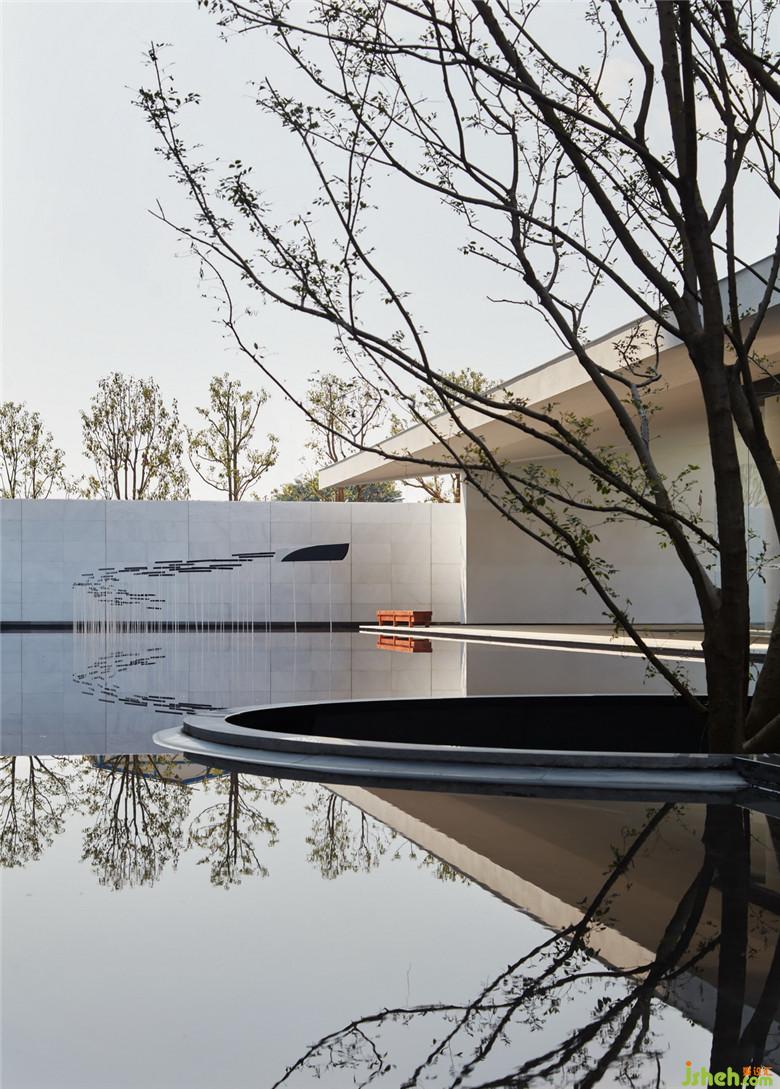 进入内部,映漾着天空的水面在脚下横向铺开,从水面升起的艺术装置像是被时光惊起的飞鸟,在宁静的空间里拍打起阵阵生趣。设计师在角落里安置的一方长椅,不仅为景致增添了层次,也为到来的人勾划一阵时间的留白,供以休憩、沉思。