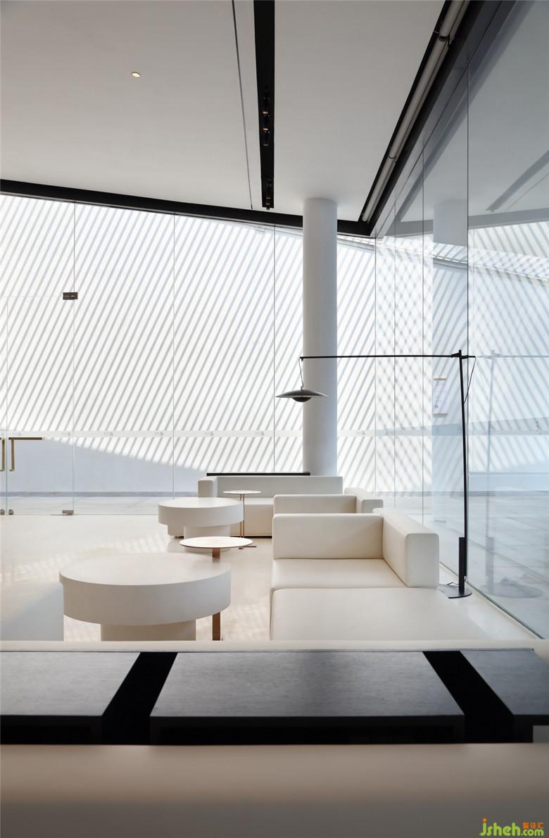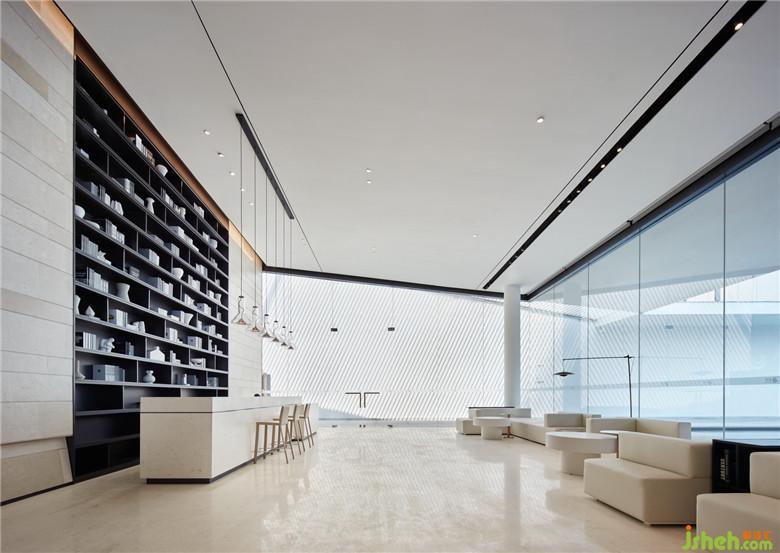 在建筑的正面处,简洁素白的立面被掏开一隅,庭院中的水景可见一二,但也仅见一二,更多的则是被藏之于后的留白与想象。设计师将原本位于建筑外侧的入口移入打开的洞口之下,向内走去,被截断画面与想象跟随视线慢慢展开,在水面映衬下营造更强烈的空间包裹感,让中庭的景观与建筑本身融为一体,建立从视觉到空间的递进连接。