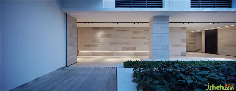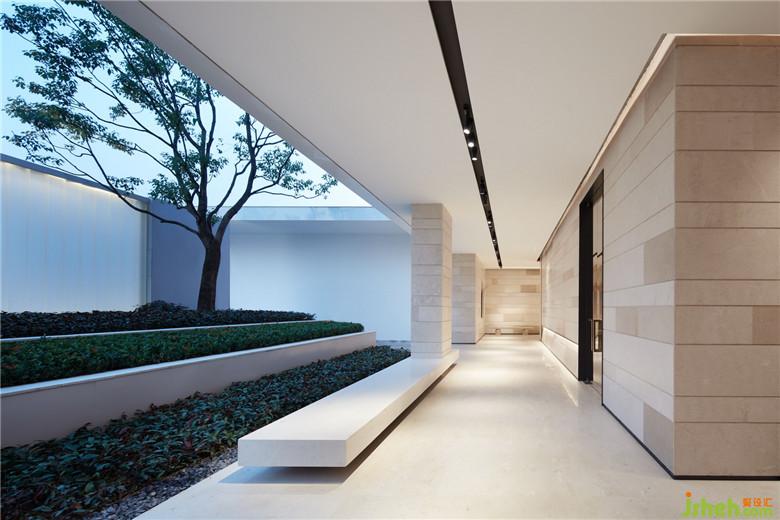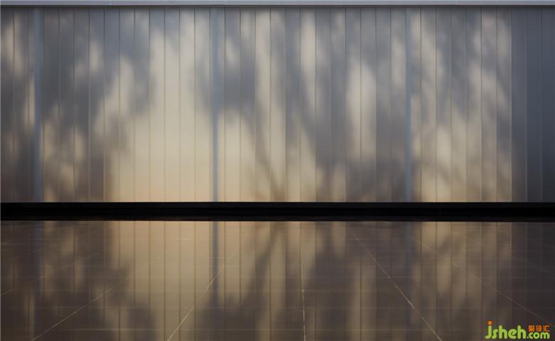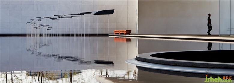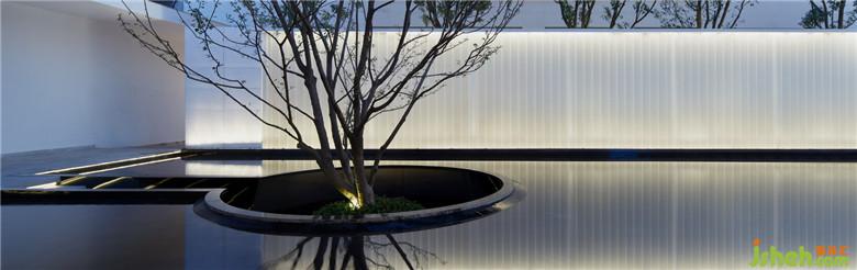 穿过连接前厅与后厅的连廊,一簇枝桠立于水面,身旁墙面素净,背后天空寂辽,不大的天地方寸间却为它留下了的无限的空白与想象,在水面的倒影里彷佛有寂静的诗意在低语。