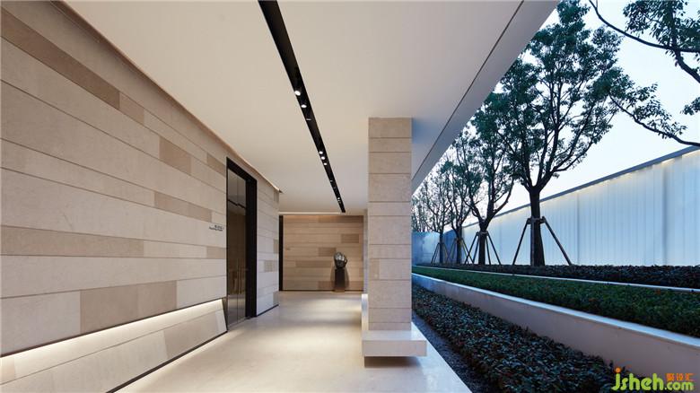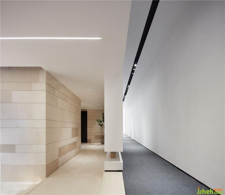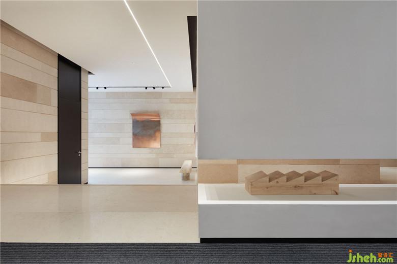 内退的玻璃隔断在打开的空间里划出了前厅核心的接待空间,通透的质感保持了内外视野的连接,让空间隔而不绝。玻璃隔断的内退为景观与内部空间留下融合的余地,同时建立内外两条流动动线,免去过多纷扰,避免“过满则溢”。在前厅内,设计师摒弃了一切多余的结构,保持空间整体的通透与轻盈,前台、沙盘、洽谈区依序安置,三两艺术品点缀层次,对建筑的初心保持尊重,以少,见多。