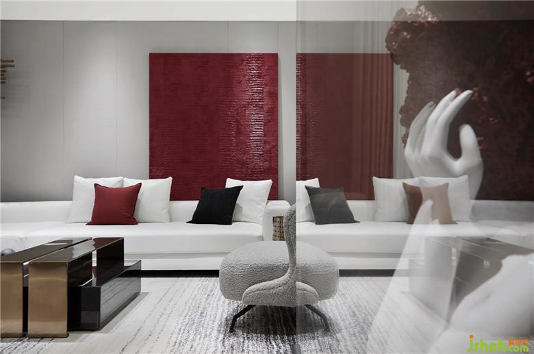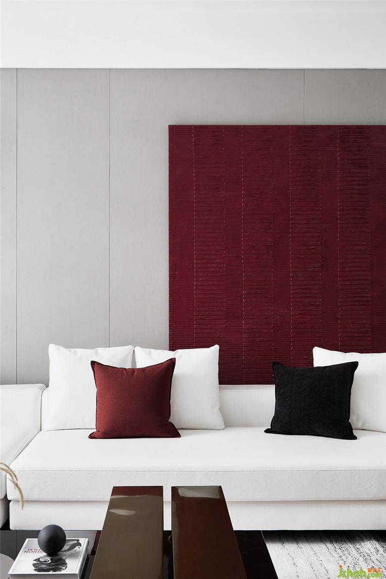 浓烈的红以不同的材质导入,贯穿于客餐厅的不同块面,不同灰度的黑与白,用肌理感强烈的棉麻、绒布材质间序其中,金属的光泽以线条的形式介入。