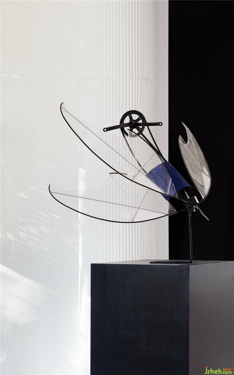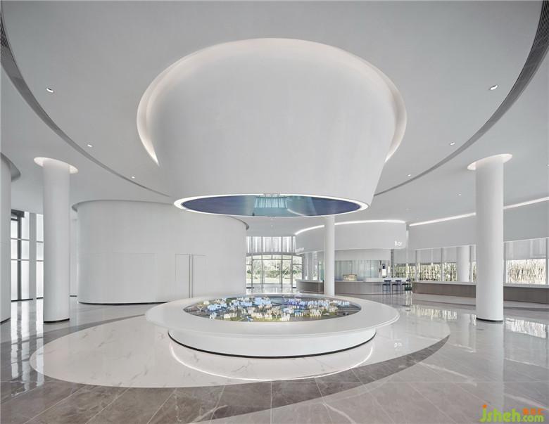 模糊的分区界限让空间得到最大化利用,接待区、洽谈区、沙盘区、影音室等布局自由,可以适应不同的场地使用需求进行快速调整。环形动线看似密闭却是自由的流动型,在相对自由的流线空间中,又有着特定的空间引导,增加了空间特有的趣味性;体验者从入口进来便能一眼纵观全景,可以因应需求随意走动,自由切换体验路线;大小错落的艺术装置形成一个流动的、旋转的空间,也成为另一条纵向递进的空间故事线索,有效延长和丰富了体验者的动线。会所设计