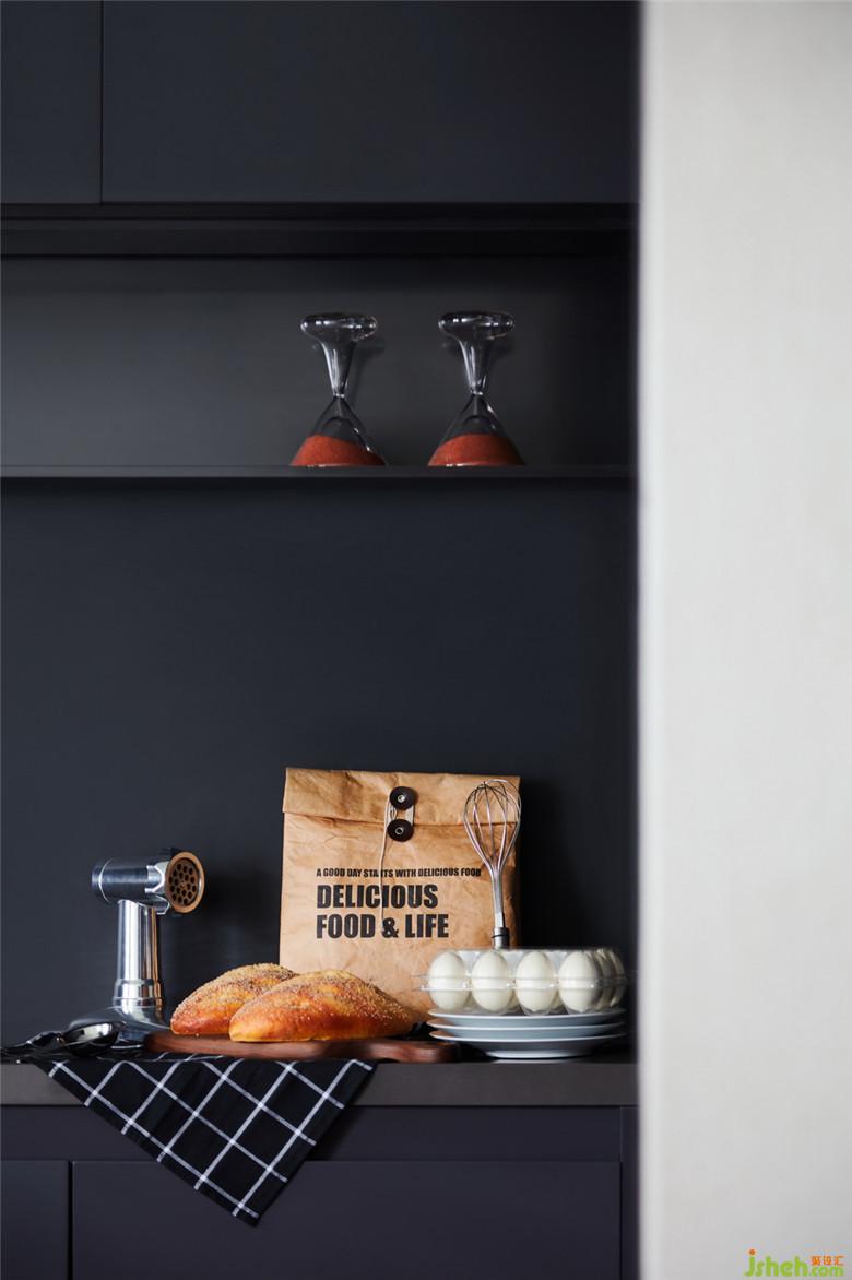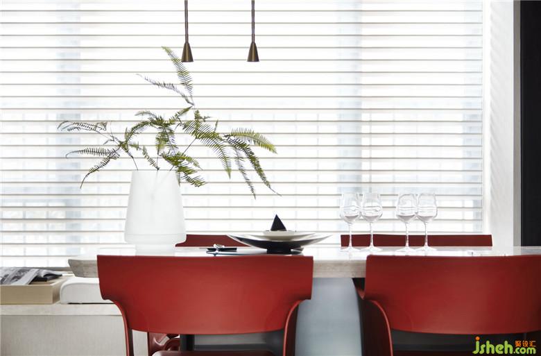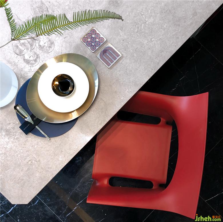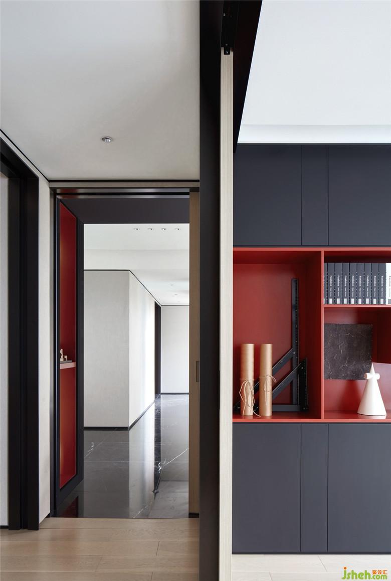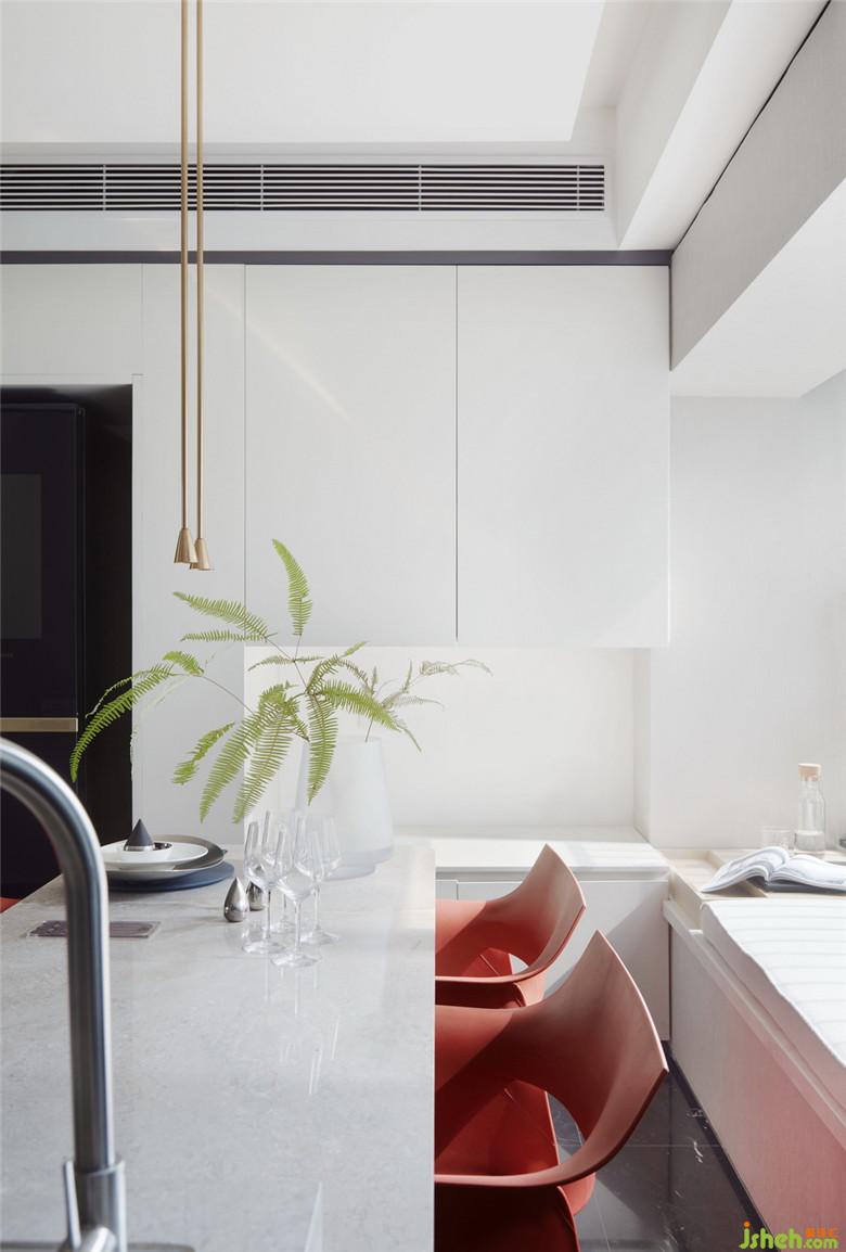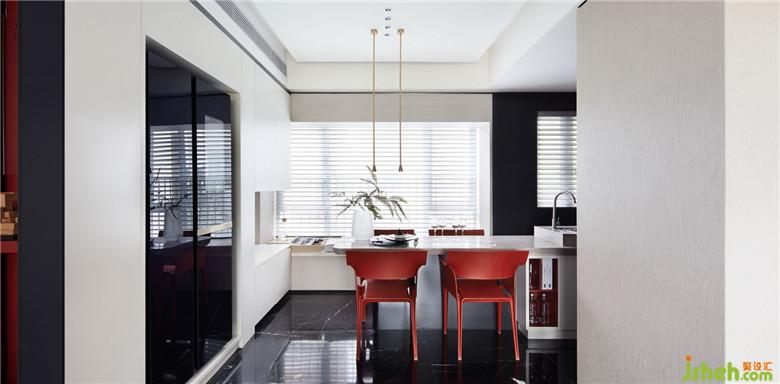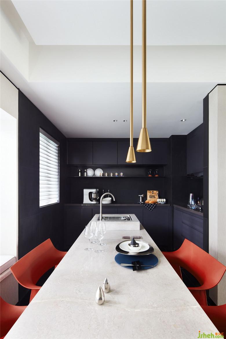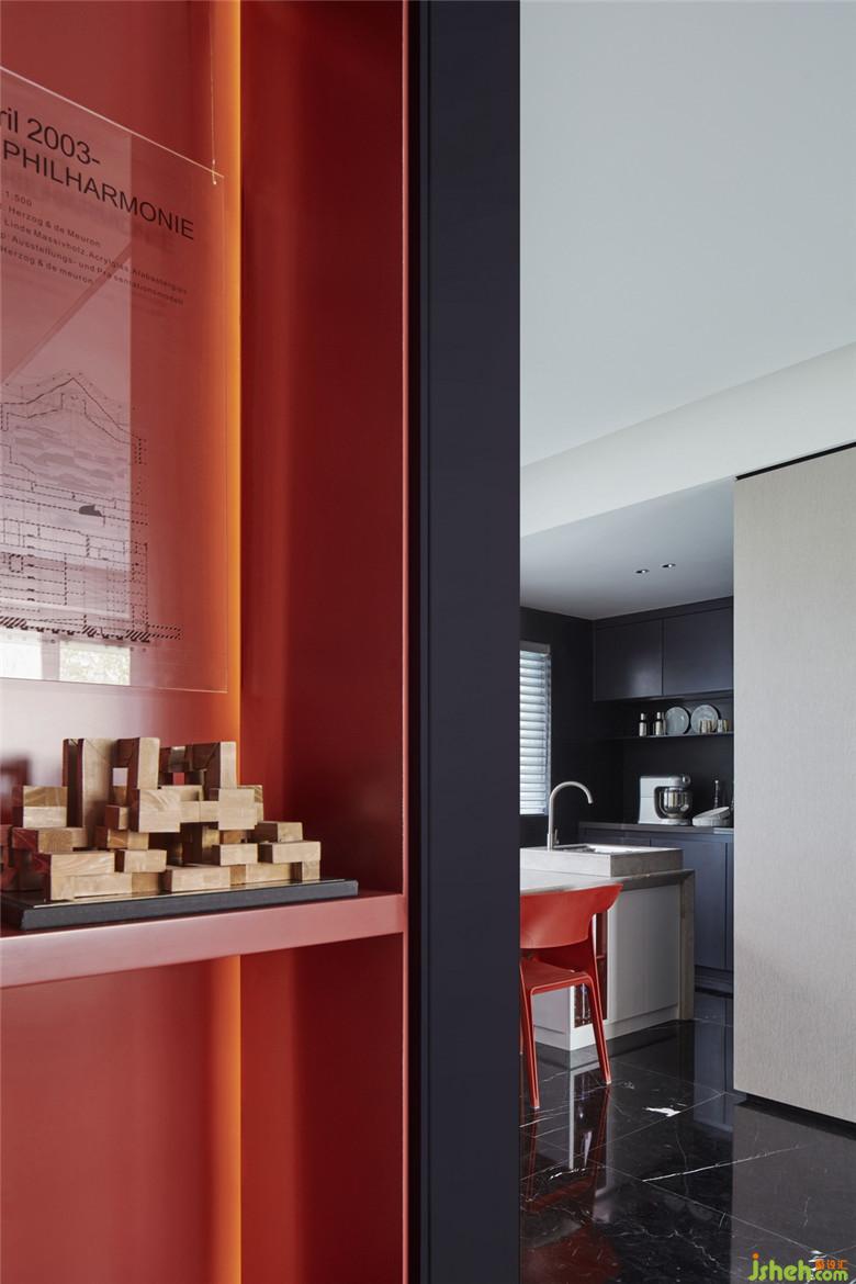 开放式厨房与餐厅二合为一,它们与沙发区相对,建构出一个欢快交融的互动性起居场景。红蓝主调的空间配色使人想起蒙德里安的风格派画作,强烈原色的构成中暗含生活逻辑。