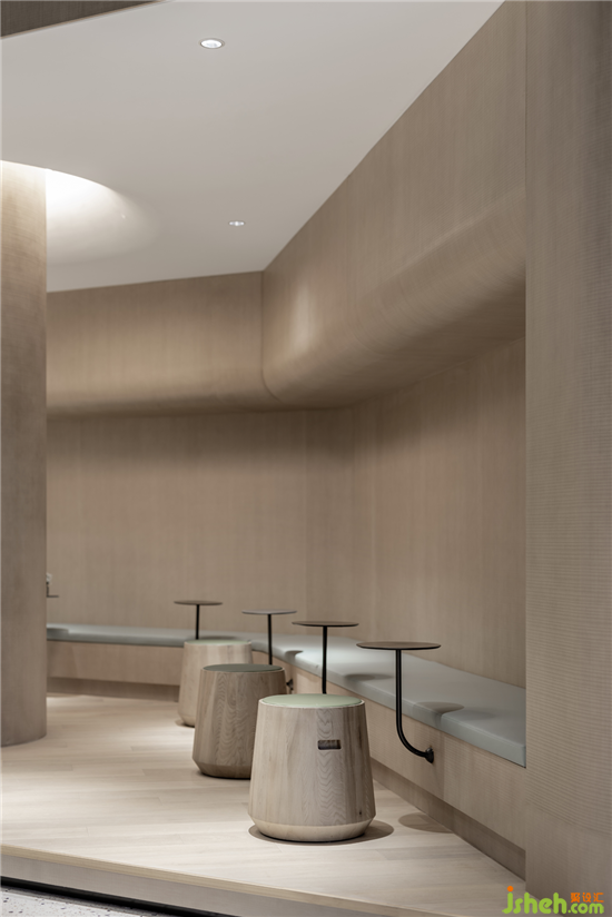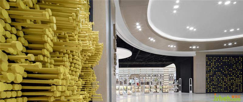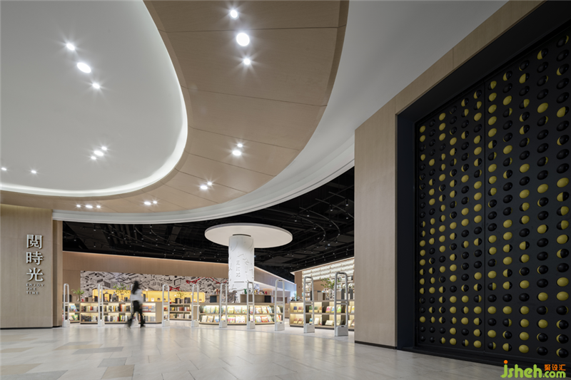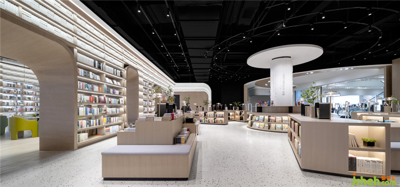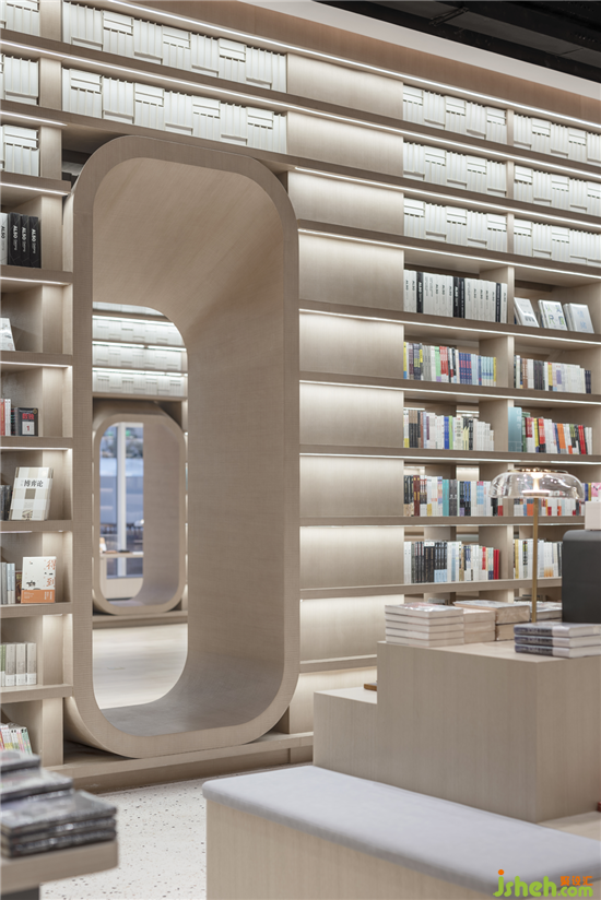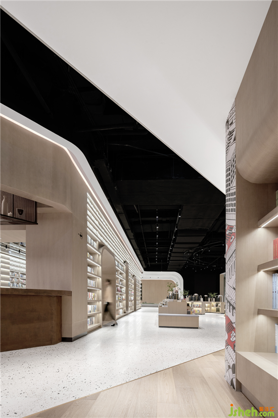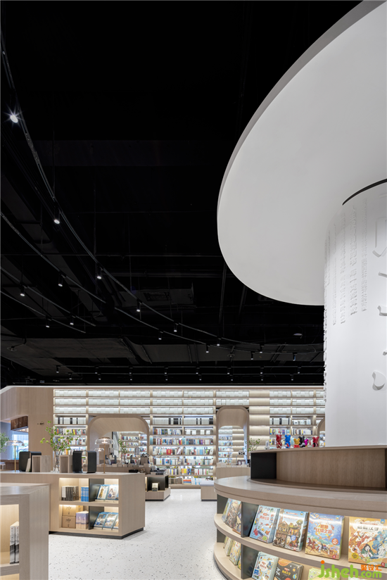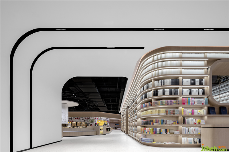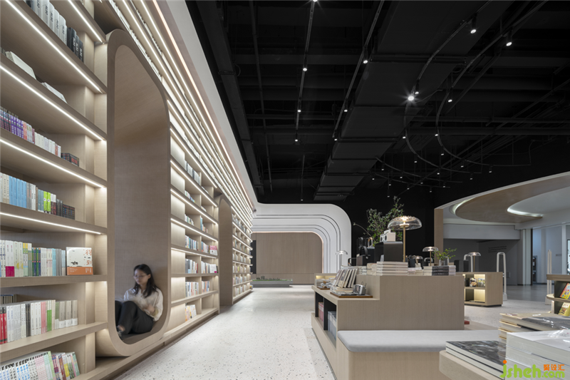 结合建筑弧形流动的线条作为设计的前提,结合商场内部和建筑外部双引流入口,空间在视觉造型上形成了顺着弧线而流动的基底,兼顾以“书”为核心的消费动线以及以购房为核心的体验动线,形成功能分区,两者之间互相交互、导流。两条动线的交界之处,亦是空间线条流动的交汇处,位于整个空间的核心,此处设定为多功能空间,承载活动的功能,以书墙围合,设置层层的阶梯,既形成了空间的完整性,又保证了空间之间的交互。而在阅读区,设计则隔绝其他业态与动线的影响,让阅读行为葆有纯粹的享受。图书馆设计