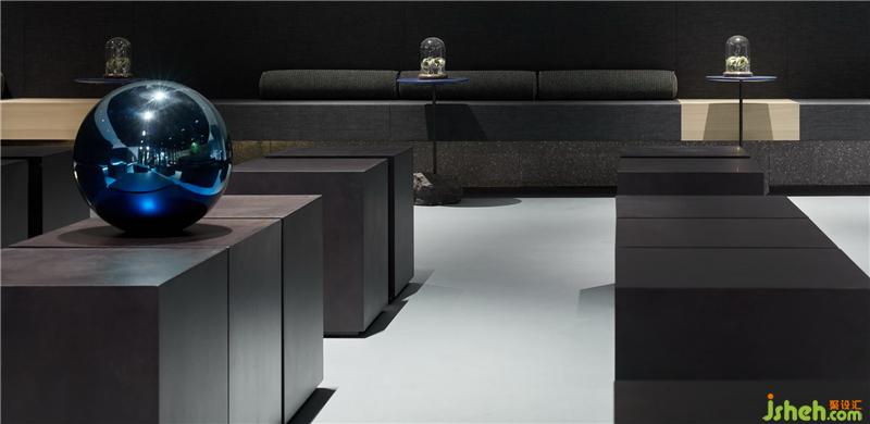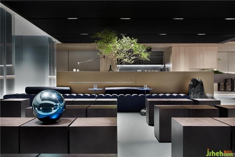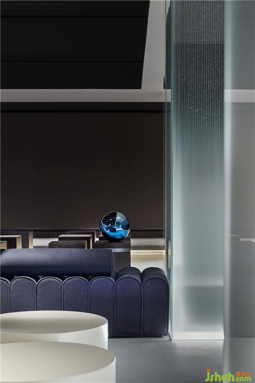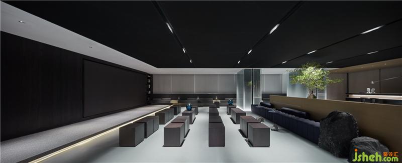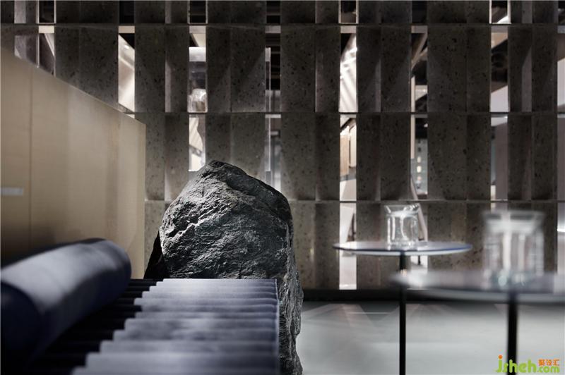 从入口处黑色的粗粝肌理的块面,到前厅光滑如镜的鹅卵石,是自然对材质干预之后两种形态的抽象。循序渐进,接待厅一个由若干块木板切磋、雕琢、叠组而成的《拥抱》装置,保留了木质的肌理和手工的痕迹,象征着人与自然改造的初级形态。装修公司